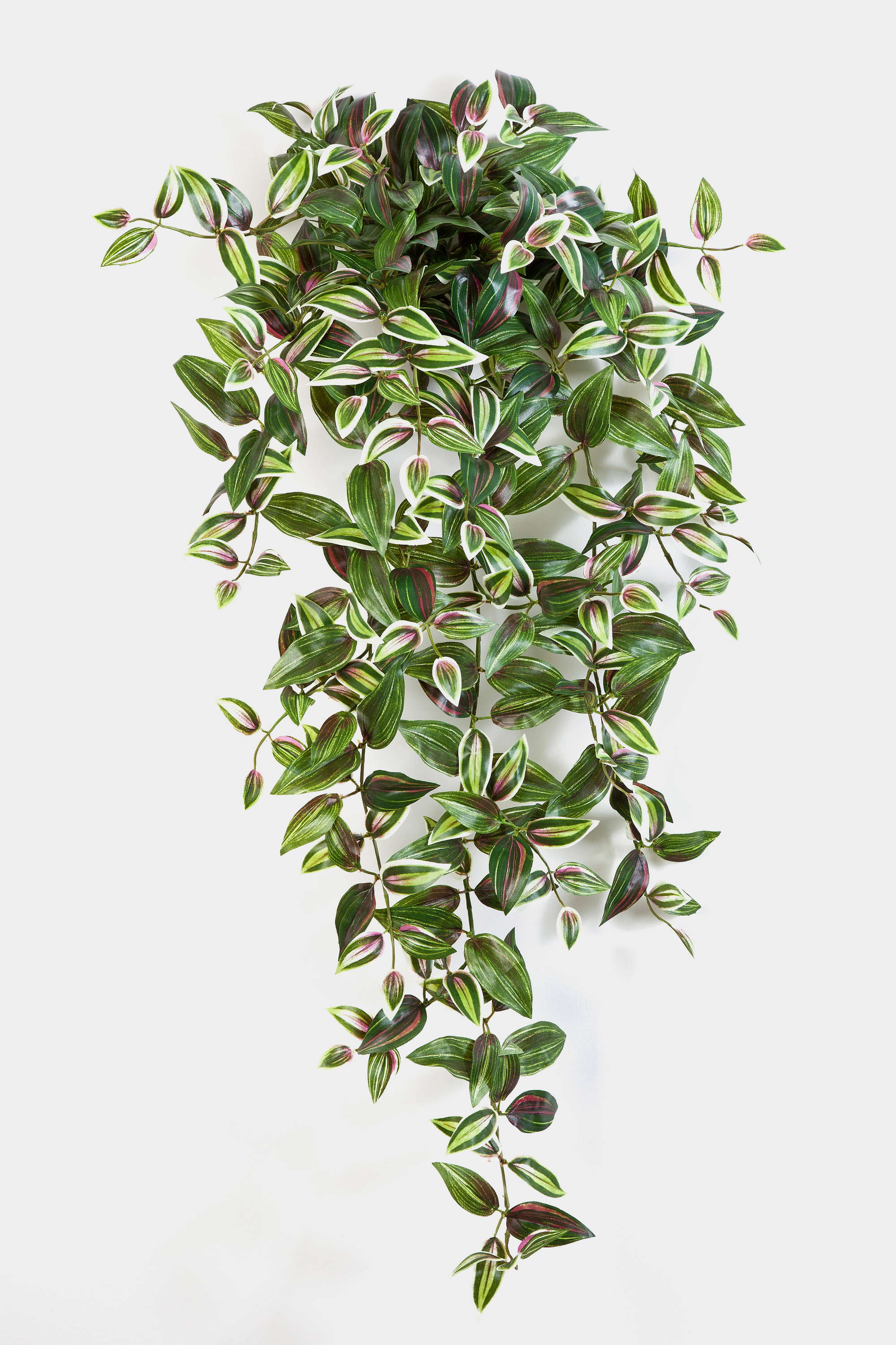 Künstlicher Busch PANCHO ist mit seinen dezenten, natürlich gemaserten Blättern in hell- und dunkelgrün und den violetten Farbakzenten ein Hingucker in jeder Wohnung. Der künstliche, hängende Busch hat ca. 15 Abzweigungen und ist ca. 95 cm lang.