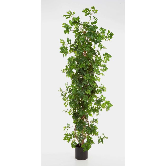Die künstliche Weinrebe NIKA hat hell und dunkelgrüne Blätter und einen braunen Stamm der mit dünnen ästen umwunden ist. Die Kunstweinrebe ist insgesamt ca. 100 cm hoch.