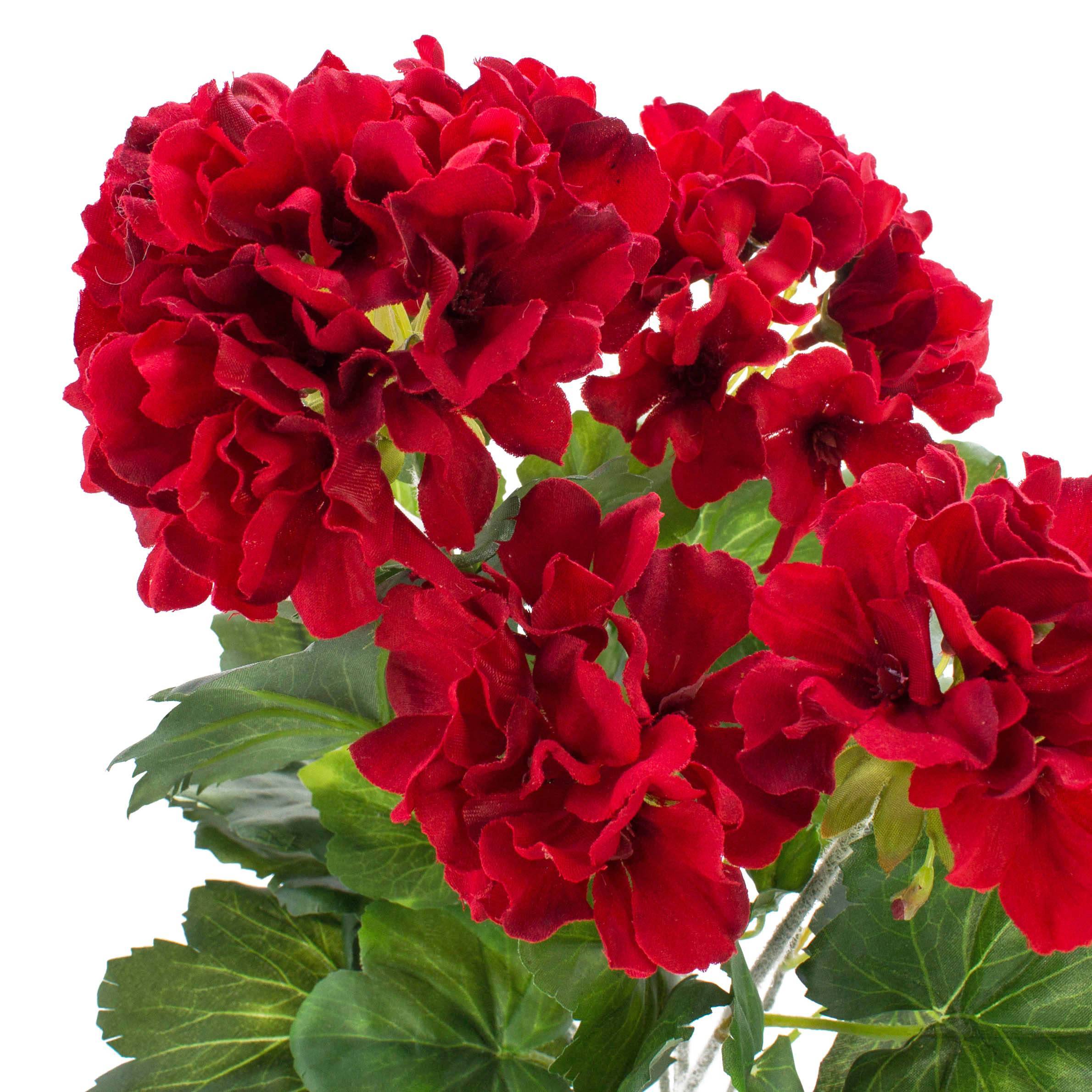 Hübsche Deko Geranie MAIKE auf Steckstab mit 5 roten Blütendolden und 33 fein gemaserten grünen Blättern. Hübsche Topf Dekoration für Ihr Zuhause.