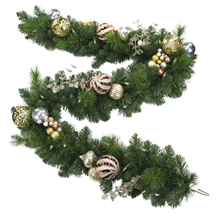 Die hübsch dekorierte Dekogirlande KRAKAU beeindruckt durch unterschiedlich farbige Weihnachtsbaumkugeln, eingearbeitete Eukalyptuszweige und 30 Lichtern.