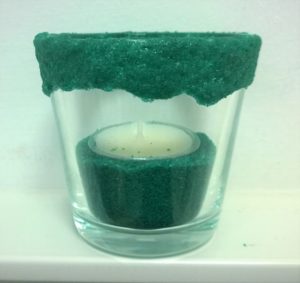Sehr schön sieht es aus, wenn ihr das Glas anschließend noch mit gleichfarbigem Sand füllt und eine Kerze dazu schenkt.