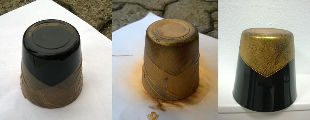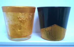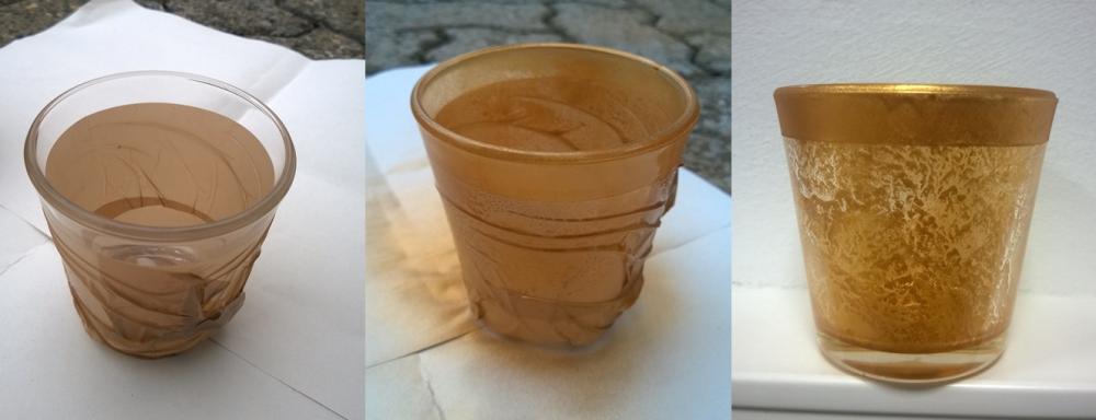 Ihr könnt entweder das ganze Glas in der Farbe eurer Wahl besprühen, oder mit Klebeband ein Muster abkleben. Edel wirkt hier immer gold oder Kupfer. Aber hier sind euch bei der Farbauswahl keine Grenzen gesetzt. Interessant wäre es auch einen Teil des Glases mit mattem Lack zu besprühen. Nachdem ihr euer gewünschtes Muster angeklebt habt sprüht eure Gläser, am besten draußen, in kurzen Sprühstößen und dünnen schichten an. So bekommt ihr das beste und gleichmäßigste Ergebnis. Empfehlenswert ist es auch hier eine etwas besser Farbe zu kaufen unsere wurde trotz sorgfältigem Auftragen recht fleckig. Ist die Farbe getrocknet, könnt ihr das Klebeband einfach abziehen und fertig ist das Geschenk.