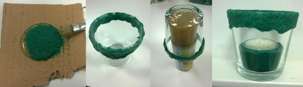 Mischt den Kleber mit dem Sand, bis es weder zu bröselig, noch zu flüssig ist. Dann tragt ihr das ganze unregelmäßig am Rand eures Glases auf. Das tolle an dieser Methode ist, dass ihr eventuelle kleinen Macken am Glasrand einfach mit dem Kleber-Sand-Gemisch auffüllen könnt. Jetzt müsst ihr das Ganze nur noch trocknen lassen. Dabei empfiehlt es sich die Gläser ab und zu auf den Kopf zu stellen, damit der ganze Sand nicht komplett nach untern rutscht. Ist die Masse angetrocknet, lässt sie sich mit dem Finger noch in Form schieben.