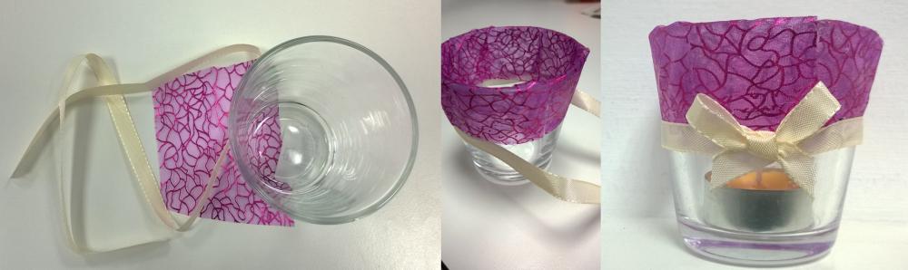 Bei einem konischen Glas hilft es den Stoff an einigen Stellen einzuschneiden um ihn glatt am Glas anliegen zu lassen. Um einen schönen Abschluss zu schaffen, haben wir noch eine Schleife herumgebunden und in Position geklebt.
