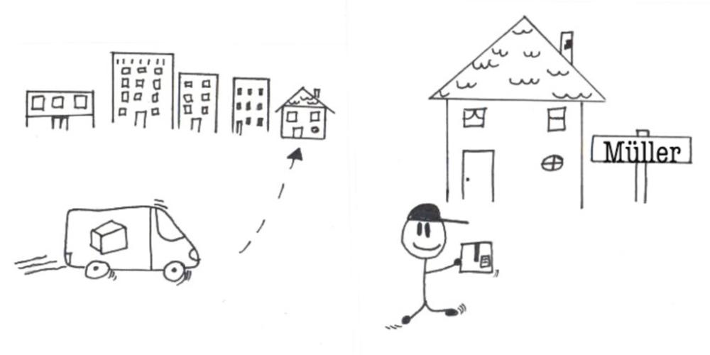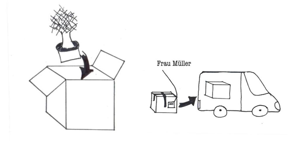 Unser Beispiel ist Frau Müller. Frau Müller wohnt in Neustadt. Sie hat gerade eben in unserem Kunstpflanzen Online-Shop einen künstlichen Buchsbaum bestellt. Nun wartet sie freudig auf die Lieferung. Wir haben versprochen, dass der Kunstbaum innerhalb der nächsten 48 Stunden bei ihr ankommen wird. Um unser Versprechen halten zu können, muss die Auftragsabwicklung im Büro und im Lager Hand in Hand gehen. Der künstliche Buchs wird also von uns fachmännisch und transportsicher verpackt und mit einem Paketaufkleber versehen. Nachmittags geht die Reise der Bestellung dann los. Jetzt kommt nämlich unser Paketzusteller und holt alle Pakete ab – unteranderem den Karton mit Frau Müllers Buchs.