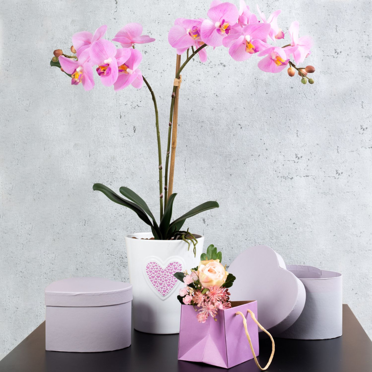 Edles Geschenk für die Lieben! Die wie echt aussehende Orchidee wird im Topf befestigt zu einem Geschenk für besondere Menschen. Als Dankeschön zum Muttertag, oder einfach mal ohne Grund verschenkt, machen Sie Ihrem Lieblingsmenschen eine große Freude. Als kleine Aufmerksamkeit z.B. in einer Geschenktüte eignet sich der Lisianthus Hortensien Stecker wunderbar. Shop the Look!
