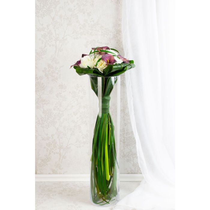 Der Hochzeitsstrauß für die Ewigkeit! Per Telefon kontaktierte uns Janine. Sie erzählte uns von Ihrem Brautstrauß und dem Wunsch diesen als Andenken an ihren großen Tag aus künstlichen Blumen nachzubinden. Sie schickte uns ein Foto ihres extravaganter Zepter- / Stabstraußes. Wie für diese Art von Strauß typisch, präsentierte er sich mit auffällig langen Stielen und Grashalmen, die durch ein breites eng geschürtes Band ein Zepter formen. Die Wahl der verwendeten Blumen fiel auf edle Callas, klassische Rosen und weiße Nelken als Zeichen der Treue. Für eine Umrahmung sorgten umgeschlagene Keulenlilien Blätter. Die Auswahl an künstlichen Blumen konnte wir wie beschrieben übernehmen. Das Binden unseres ersten Zepterstraußes stellte uns zunächst vor eine Herausforderung. Aufgrund der glatten künstlichen Oberfläche verrutschten die Blätter beim Zusammenbinden. Die Grashalme konnten ebenfalls nur mühsam Halm für Halm eingebunden werden. Stolz präsentierten wir Janine unseren ersten Vorschlag. Sie war begeistert von unserer Arbeit, wünschte sich jedoch kleinere Blüten, da diese im Original auch nicht so groß waren. Rosen und Nelken fanden sich schnell im Lager, eine andere violette Calla gab es jedoch nicht in unserem Sortiment. Daraufhin durchsuchten wir zahlreiche Lieferantenlisten nach einer solchen Blume. Dies nahm zwar viel Zeit in Anspruch, wurde abschließend, aber positiv belohnt. Kurzerhand bestellten wir die kleine Calla und ergänzten sie in unserem Sortiment. Durch den Austausch der Blüten verlor der Blumenstrauß prompt an Durchmesser. Nun entsprach auch die Größe dem Original, wodurch wir auch bei dieser Kundin die Zustimmung des Auftrages erhielten. Wollen auch Sie einen künstlichen Hochzeitsstrauß für die Ewigkeit? Shop the Look!