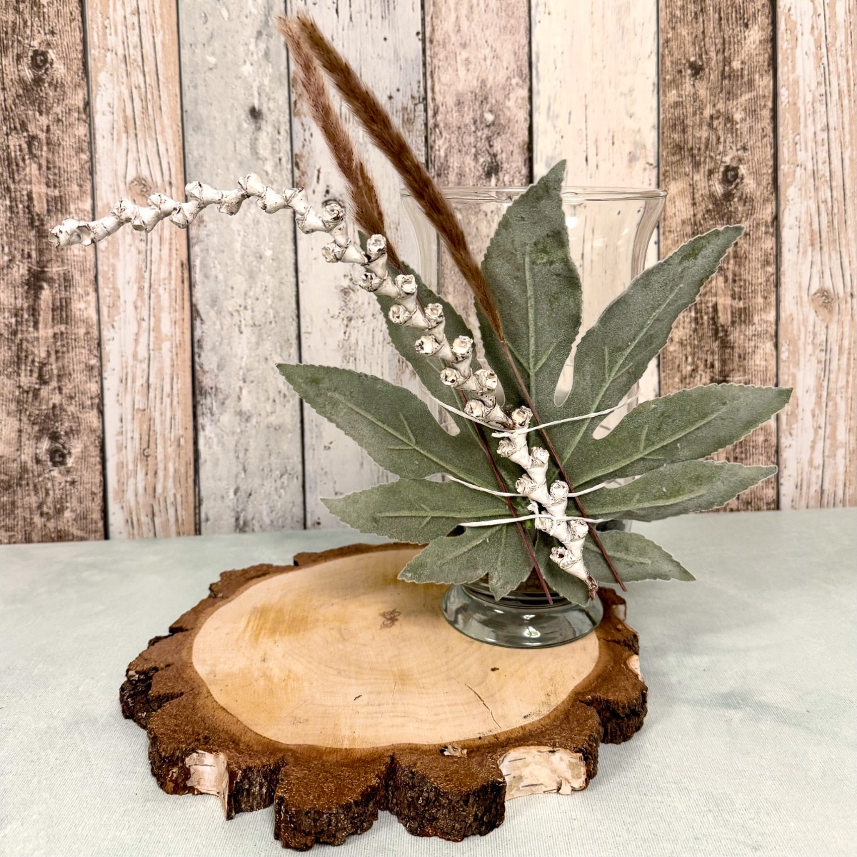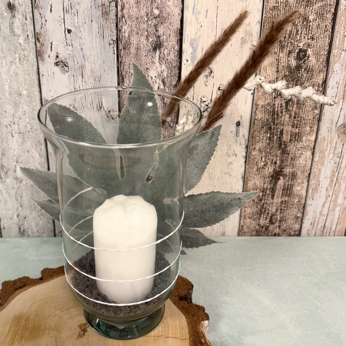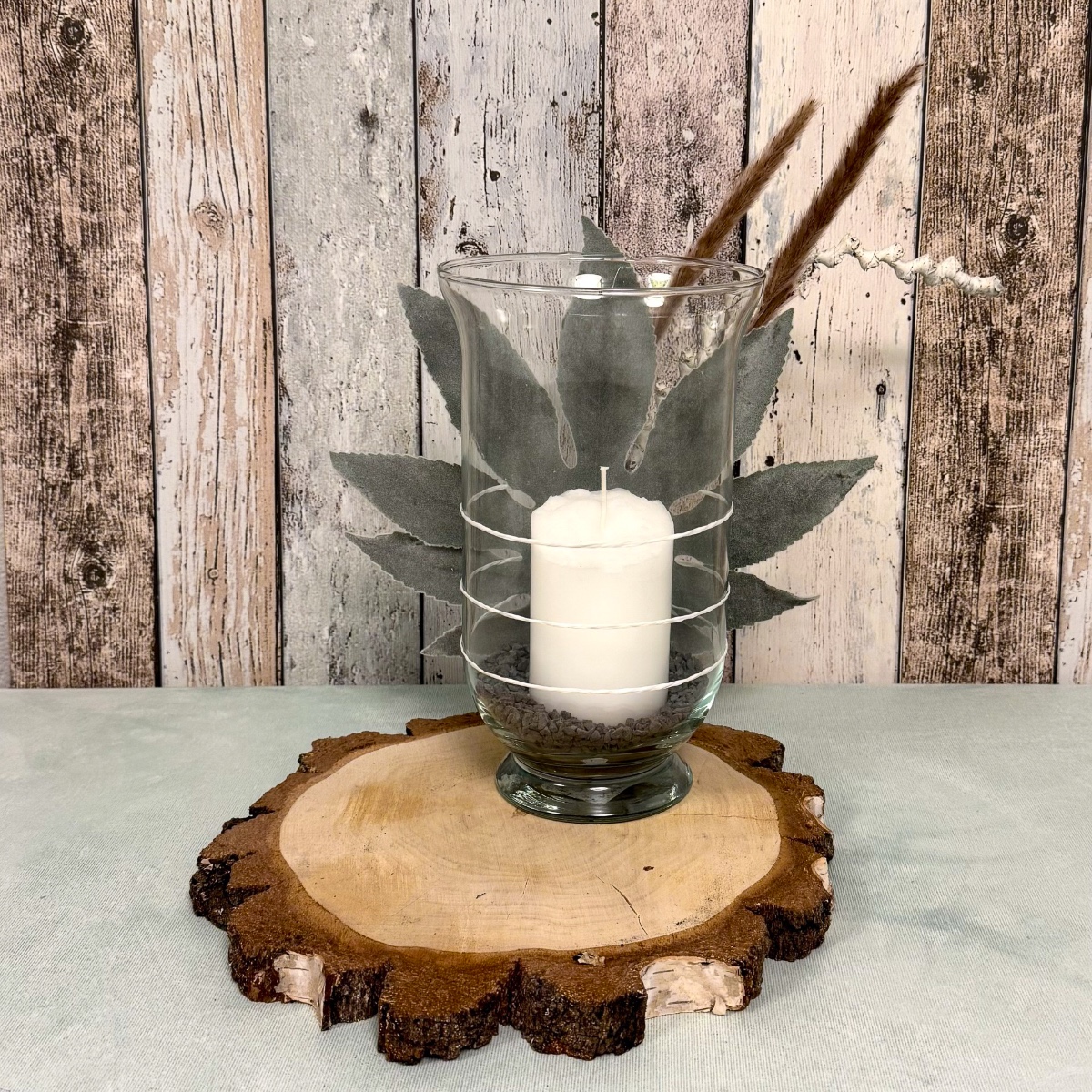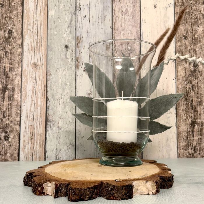 Erdig, echt und einfach schön! Dieses liebevoll arrangierte Windlicht bringt ein Stück Natur ins Zuhause. Auf einer runde Birkenholzscheibe mit natürlicher Rindenkante steht ein hohes Windlichtglas, gefüllt mit dunklem Korkgranulat und einer weißen Kerze, die für sanftes, warmes Licht sorgt. Hinter dem Glas ist ein samtiges, künstliches Araliablatt arrangiert, das dem Look eine weiche, harmonische Tiefe verleiht. Ergänzt wird das Ensemble durch getrocknete Gräserrispen, die zusammen mit dem Blatt durch weißen Papierdraht dekorativ am Glas befestigt sind – ein feines Detail, das Natürlichkeit und Handarbeit spürbar macht. Ein kleiner, natürlicher Blickfang, der Ruhe und Wärme ausstrahlt! Shop the Look!