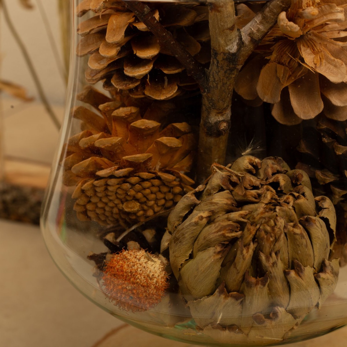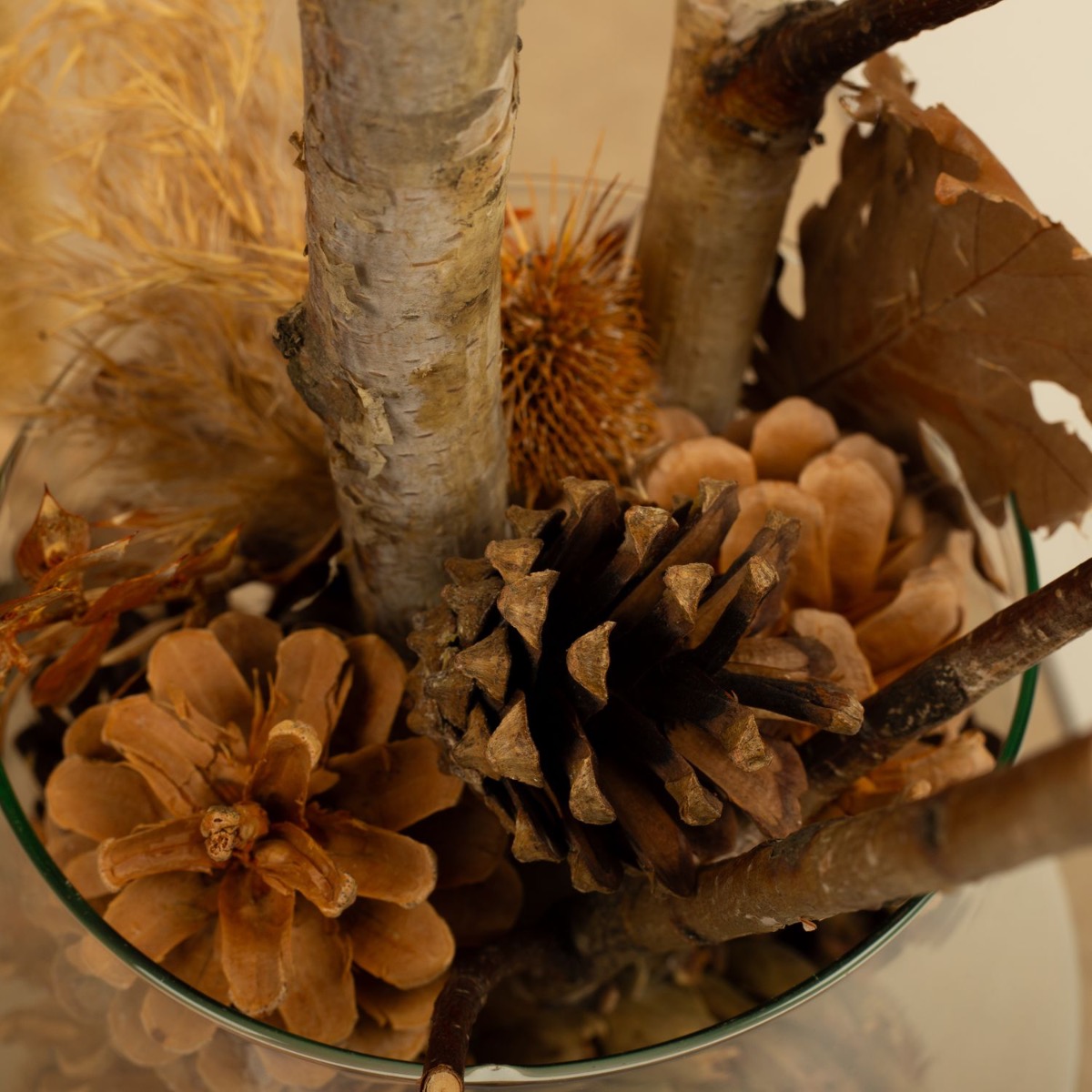 Gestaltungstipp: Das herbstliche Potpourri aus Kiefernzapfen und Trockenzweigen in das riesige Cognacglas füllen. Die Ästchen passen genau in die Zylindervase und werden einfach reingestellt. Sehr einfach zum Nachmachen!