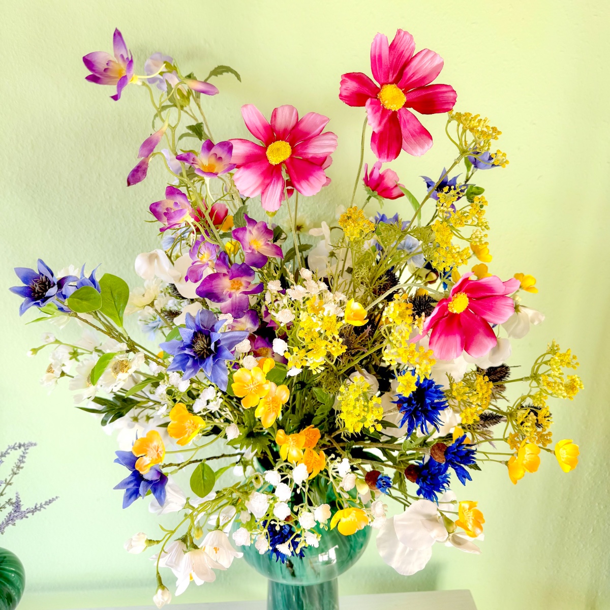 Verspielt. Frisch. Voller Leben! Manchmal sind es bereits verwirklichte Ideen, die neue Inspiration schenken: Dieser Strauß entstand aus dem Wunsch einer Kundin, einen früheren Kundenwunsch neu aufleben zu lassen – und ihn ganz nach ihren eigenen Vorstellungen weiterzuentwickeln. Der locker gebundene Wiesenstrauß greift die natürliche Leichtigkeit des Originals auf und überzeugt durch seine harmonische, lebendige Ausstrahlung. Verschiedene Blüten fügen sich zu einem Arrangement, das wie zufällig gepflückt wirkt und dennoch mit viel Feingefühl gestaltet ist. Ergänzt wird das Ensemble durch einen separat arrangierten Lavendelbund in einer passenden Vase, der einen ruhigen, sanften Kontrast setzt. Eine Topfpflanze Glückstaler rundet das Gesamtbild ab und bringt eine moderne, klare Note hinein – als Symbol für Beständigkeit und Glück. So entsteht ein stimmiges Zusammenspiel aus floraler Leichtigkeit und dekorativer Ergänzung – individuell interpretiert und mit Liebe zum Detail umgesetzt. Ein Look, der zeigt, wie aus Inspiration etwas ganz Eigenes wird – persönlich, zeitlos und voller natürlicher Schönheit. Shop the Look!