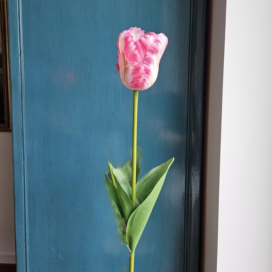- Die Blütenblätter haben den für eine Papageientulpe typischen gewellten Rand, und fühlen sich durch die besondere Oberfläche - real touch - sehr natürlich an, der Stiel ist mit großen Blättern umhüllt