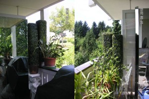 Für eine besondere Variante hat sich Alexandra Weber aus Rickenbach entschieden. Auf jeder Balkon Seite wurden von Ihr zwei künstliche Buchsbaum Säulen mit 1480 Blättern abgestuft aufgestellt. Somit ist ein hübscher und pflegeleichter Sichtschutz gelungen, der im Einklang mit natürlichen Pflanzen steht.