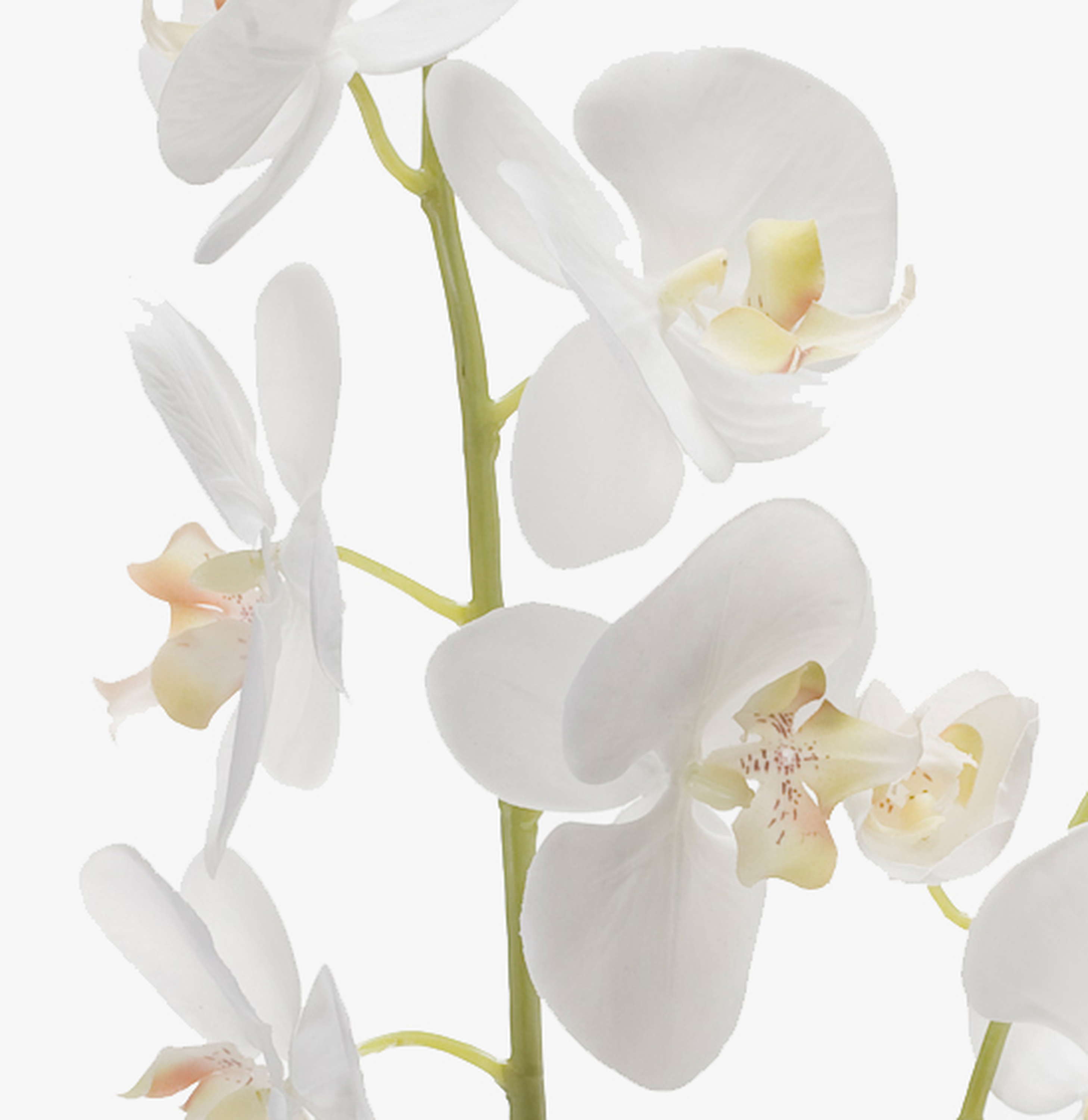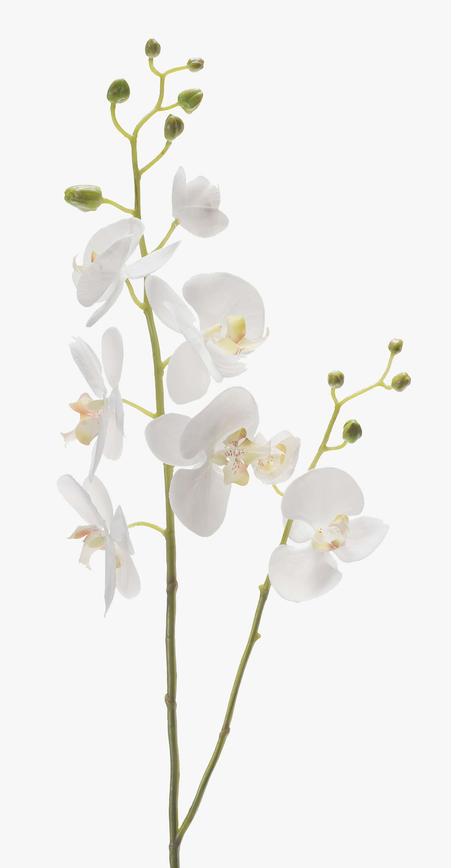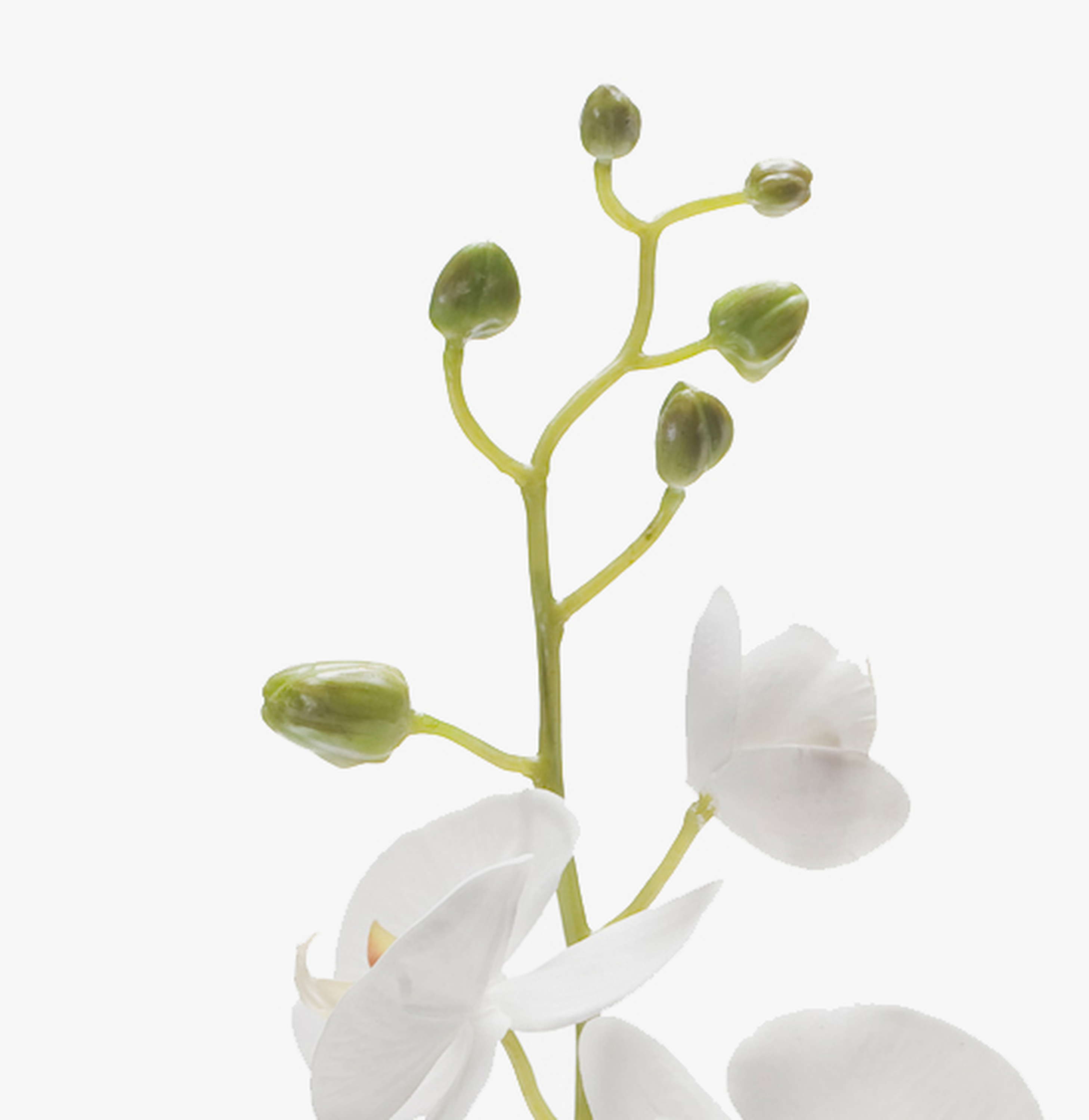 Der Kunstzweig Phalaenopsis Orchidee LAHNA hat 8 weiße Orchideenblüten und 10 Knospen. Der Kunst Orchideen Zweig mit einer Länge von 95 cm ist in Kombination mit einer echten verblühten Orchidee ein echter Hingucker.