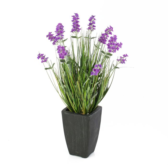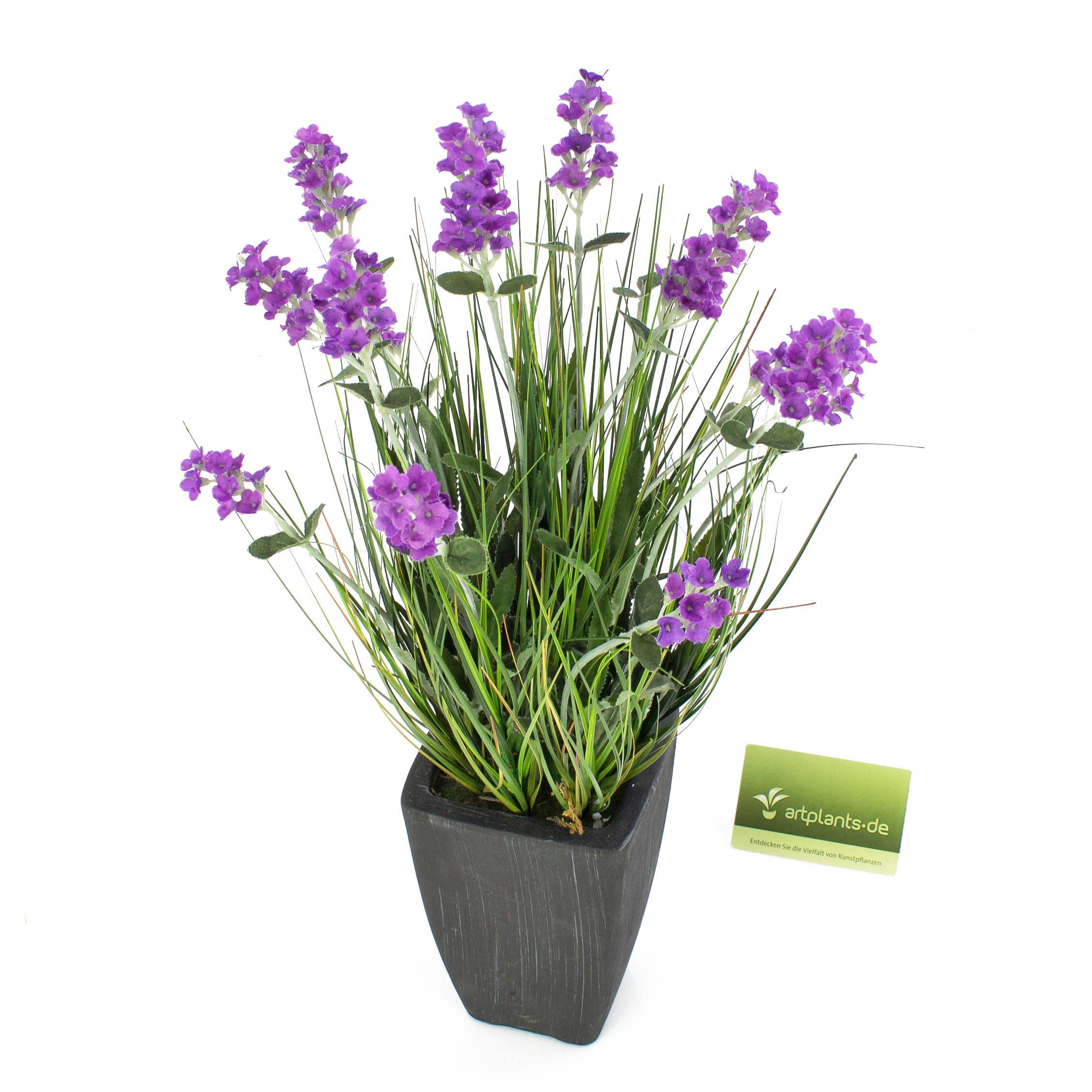 Kunst Lavendelpflanze im schönen grauen Dekotöpfchen bei einer Höhe von ingesamt ca. 45 cm. Zur sommerlichen Dekoration als Blickfänger für Tische und Sideboards.