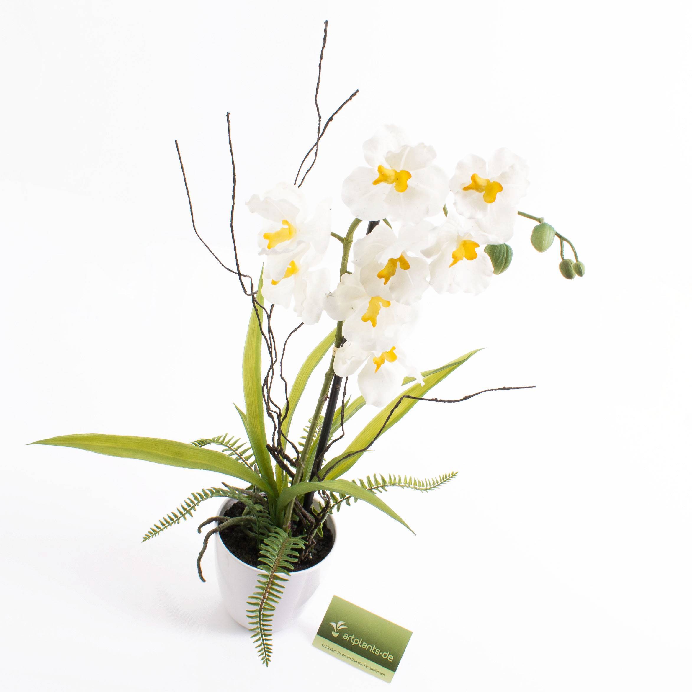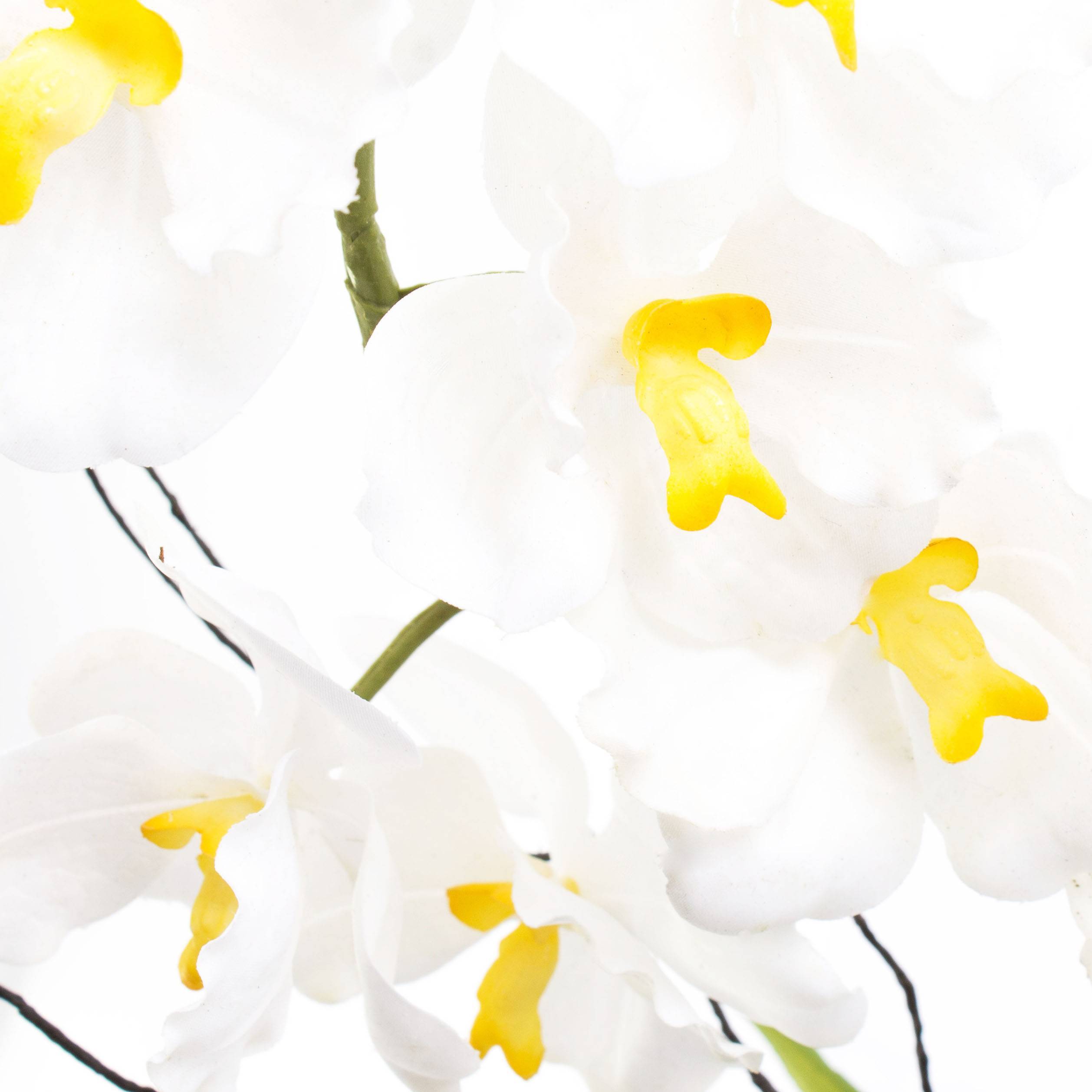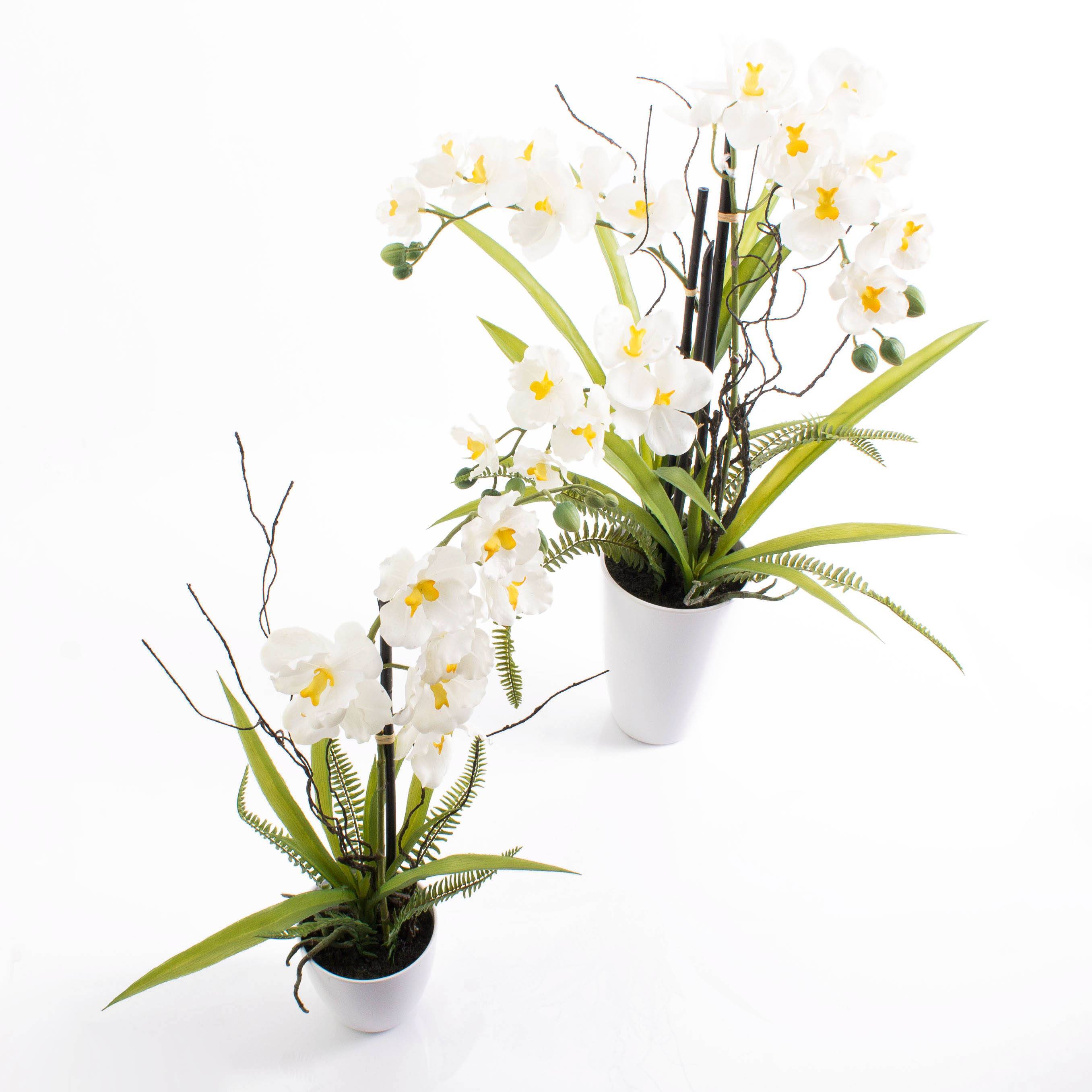 Kunst Phalaenopsis-Orchidee MELINA in Blütenfarbe weiß. Die künstliche Orchidee hat eine Gesamthöhe von ca. 65 cm und wird in einem schönen weißen Deko-Töpfchen geliefert.