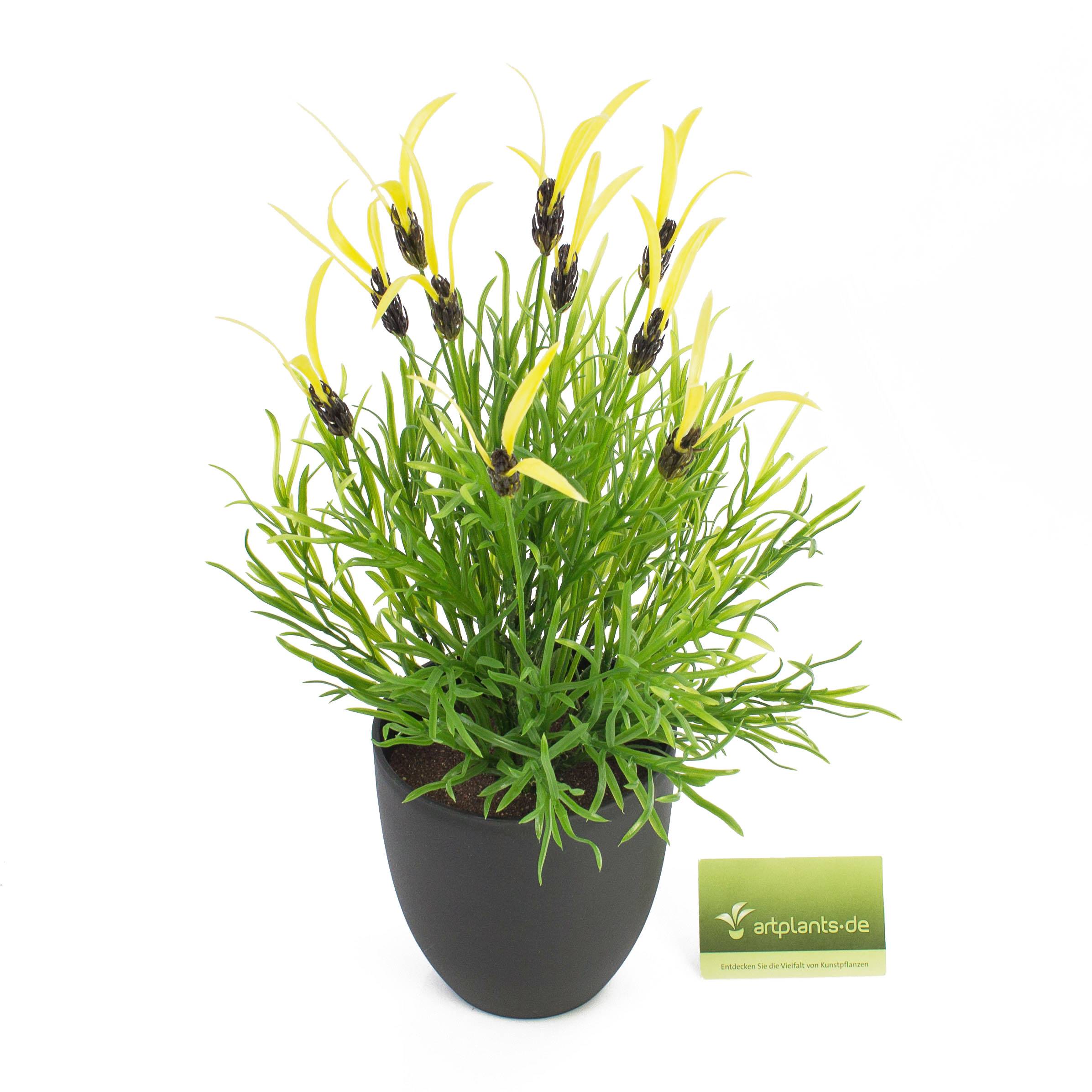Kunst Schopf-Lavendel in schöner Dekoedelschale. Der Lavendel ist insgesamt ca. 40 cm hoch und hat gelbe Blütenblättchen.
