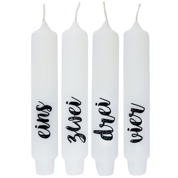 - In Farbe weiß mit schwarzer Schrift, insgesamt 4 Kerzen mit verschiedenen Sprüchen, Advent: eins, zwei, drei, vier