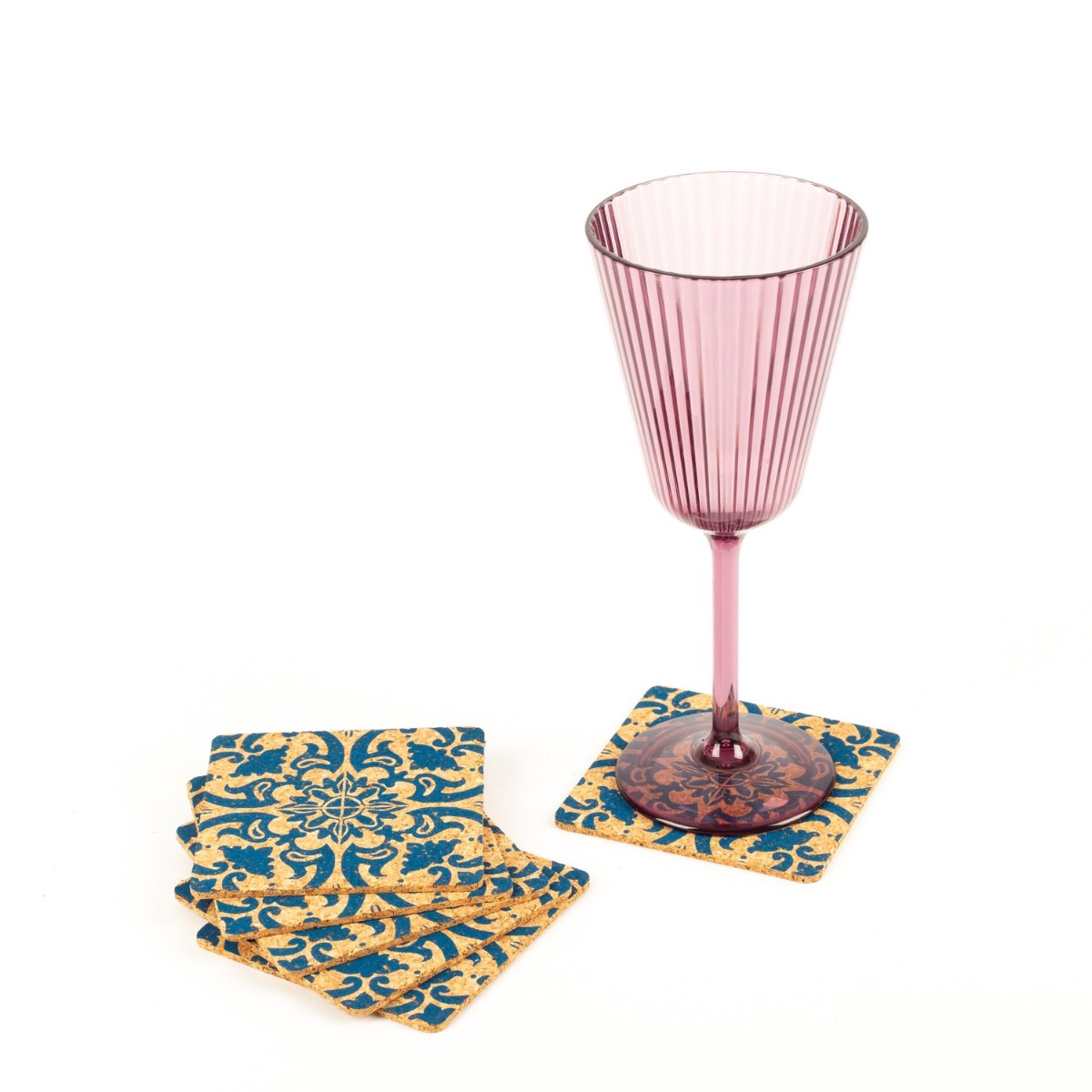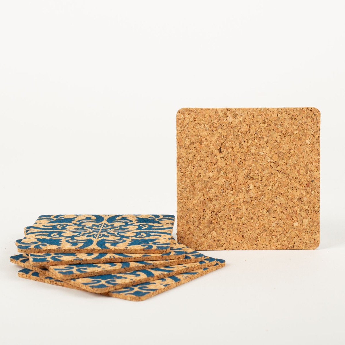 Quadratischer Glasuntersetzer Kork ROHESIA, 6 Stück, Orientalisches Muster, natur-blau, 9x9cm, Stärke 0,3cm