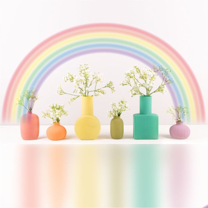 Die Farben des Regenbogens! Die Welt ist bunt und unser Unternehmen ist es ebenfalls. Damit ist nicht nur unser farbenfrohes Sortiment gemeint, wir meinem damit das gesamte Team. Egal woher man kommt, was man liebt oder welchem Glauben man folgt, bei artplants sind alle gleich. Die matte Oberfläche und die zarten Pastellfarben dieser Flaschen lassen sich wunderbar zu einer Regenbogenfarbfolge zusammenstellen. Ein wenig Schleierkraut als Beiwerk und fertig ist die Tischdekoration z. B. für eine gleichgeschlechtliche Hochzeitsfeier. Shop the Look!