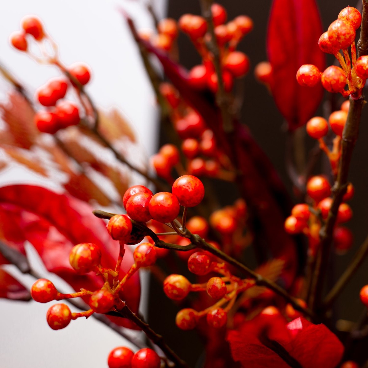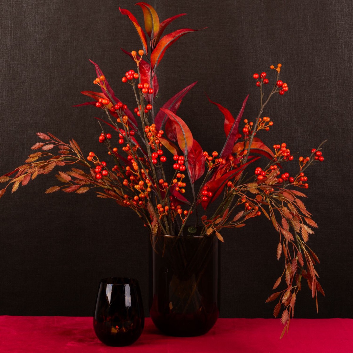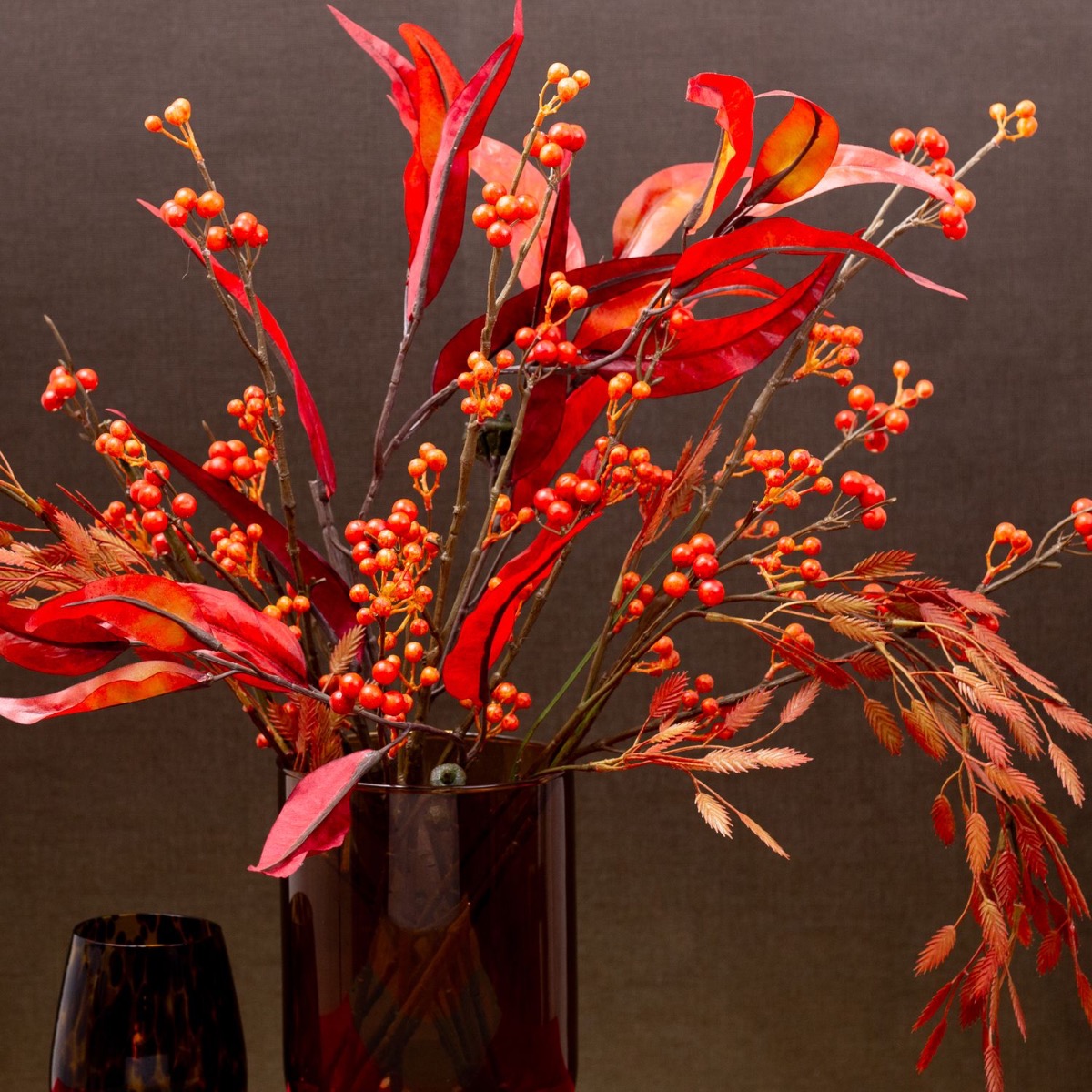 Rot, die Farbe des Feuers und der Liebe! Der Herbst bringt einfach zauberhafte Farben hervor. Besonders fasziniert uns das Rot, das in dieser Jahreszeit zwischen den leblosen Blättern herausleuchtet. Beerenzweige, Eukalyptusblätter und das rötliche Plattährengras wirken wie ein Feuer, das zur trüben und kühlen Jahreszeit angezündet wurde. Das bringt Wärme an jeden Ort! Shop the Look!