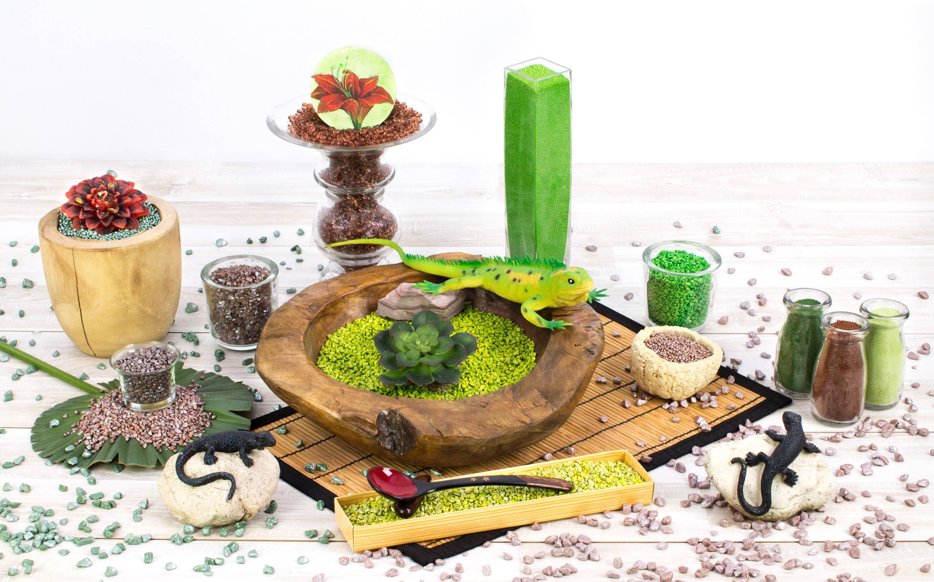 - feiner Sand eingefärbt in Pigmentfarbe moosgrün, Farbe ist für Tiere und Pflanzen unbedenklich
