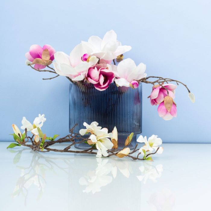 Blau, wie der Himmel! Magnolien erfreuen so manches Herz im Frühsommer und wirken durch ihre großen Blüten imposant und elegant. Diese Blume hat die große Bewunderung aber auch verdient, wenn man bedenkt, dass sie bereits in der Kreidezeit geblüht hat. Was die Dinosaurier wohl weniger zu schätzen wussten, huldigen wir dafür ganz besonders. Die Schönheit dieser Blüten kommt in der royalblauen, ovalen Vase besonders gut zur Geltung und benötigt absolut kein Beiwerk. Shop the Look!