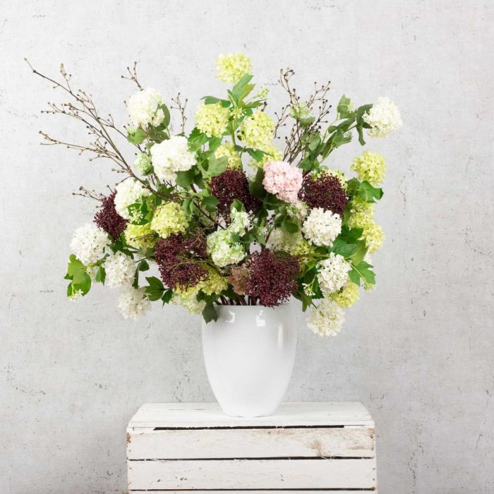 Weiß, Grün und Bordeaux! Schneebälle sind wirklich außergewöhnliche Blumen. Viele kleine Blüten werden zu einer großen, kugelartigen Blüte, die aussieht wie ein Schneeball. Dieser Look wurde aus verschiedenen Farben und Blütenständen des Schneeballs kreiert und zeigt, wie üppig und imposant diese Blumen sind. Shop the Look!