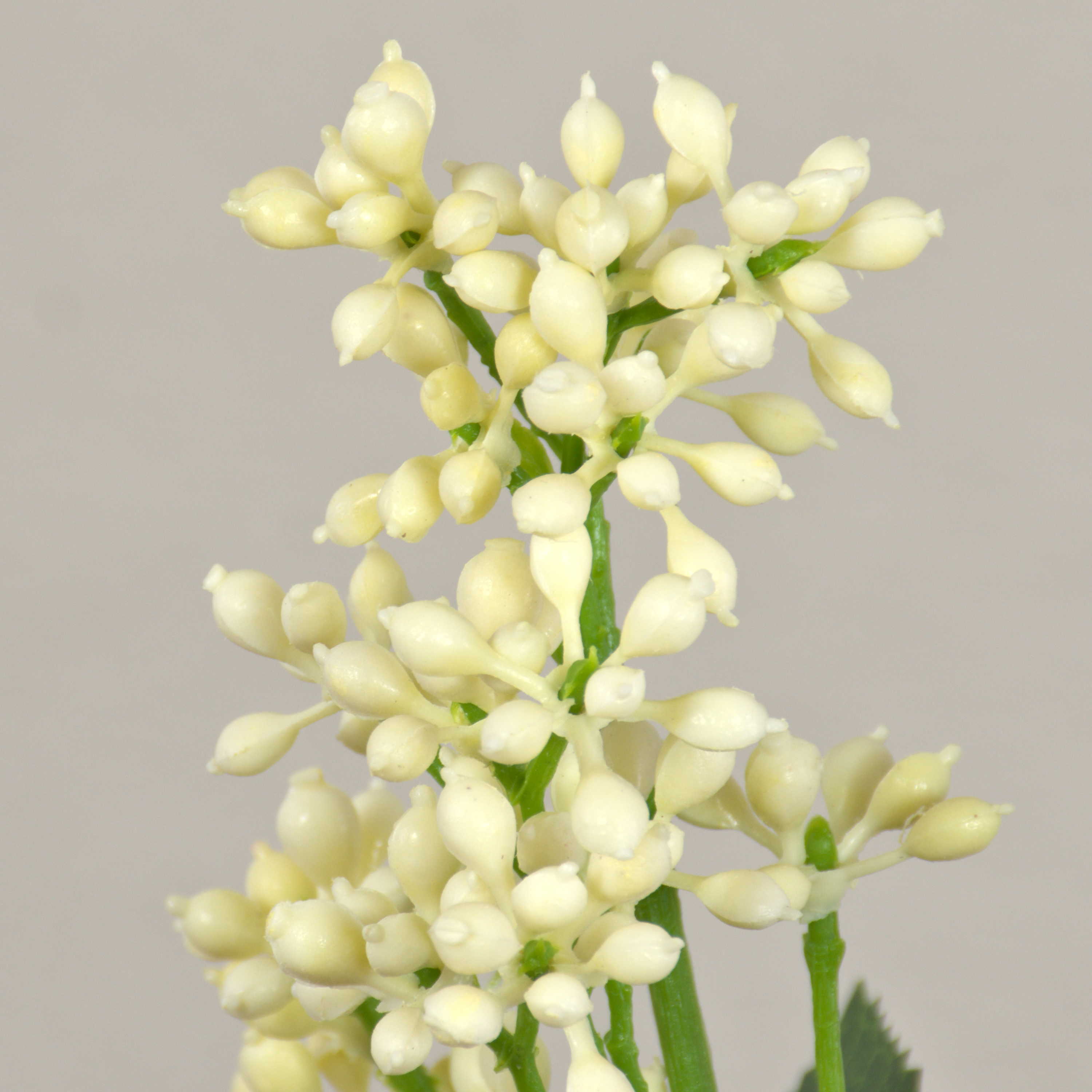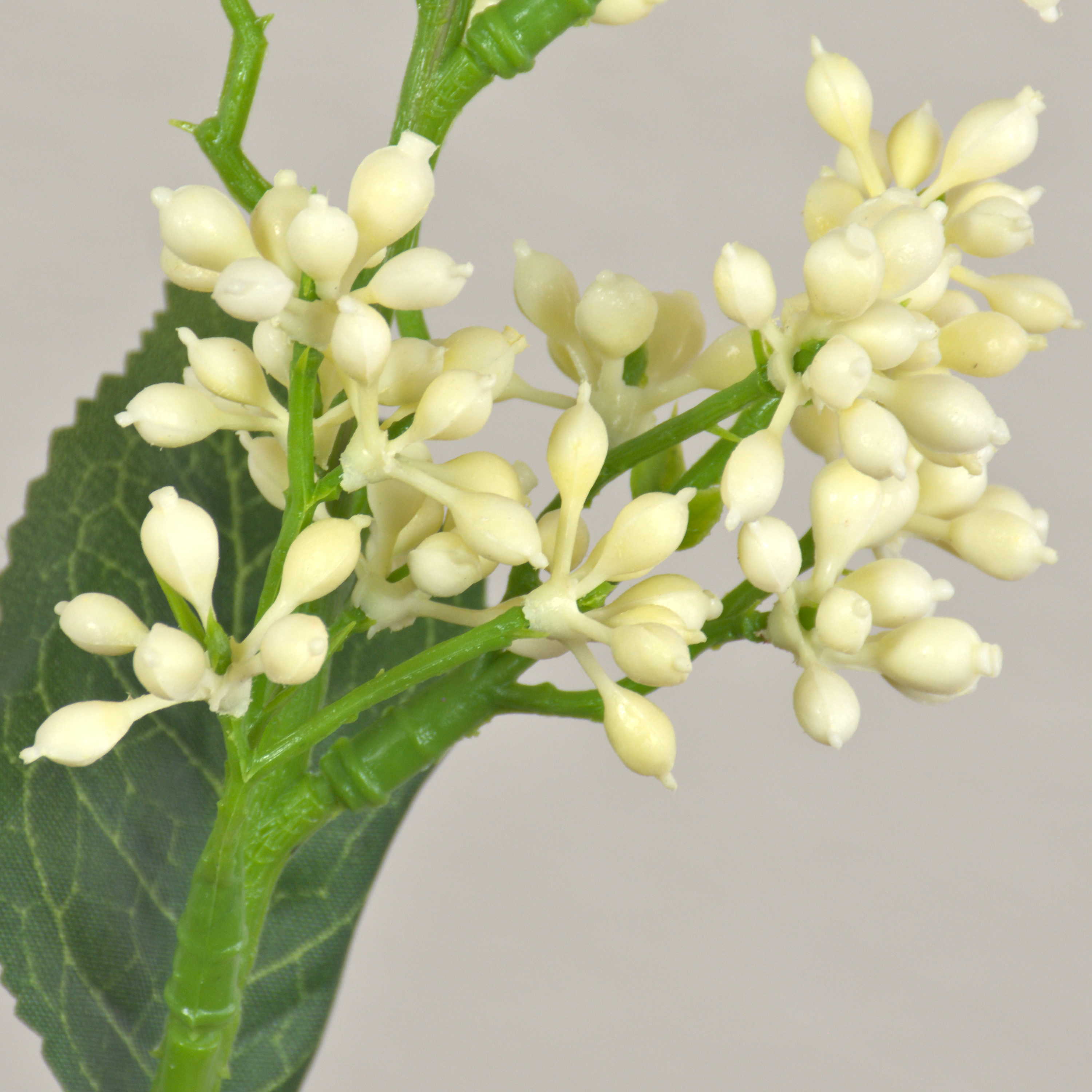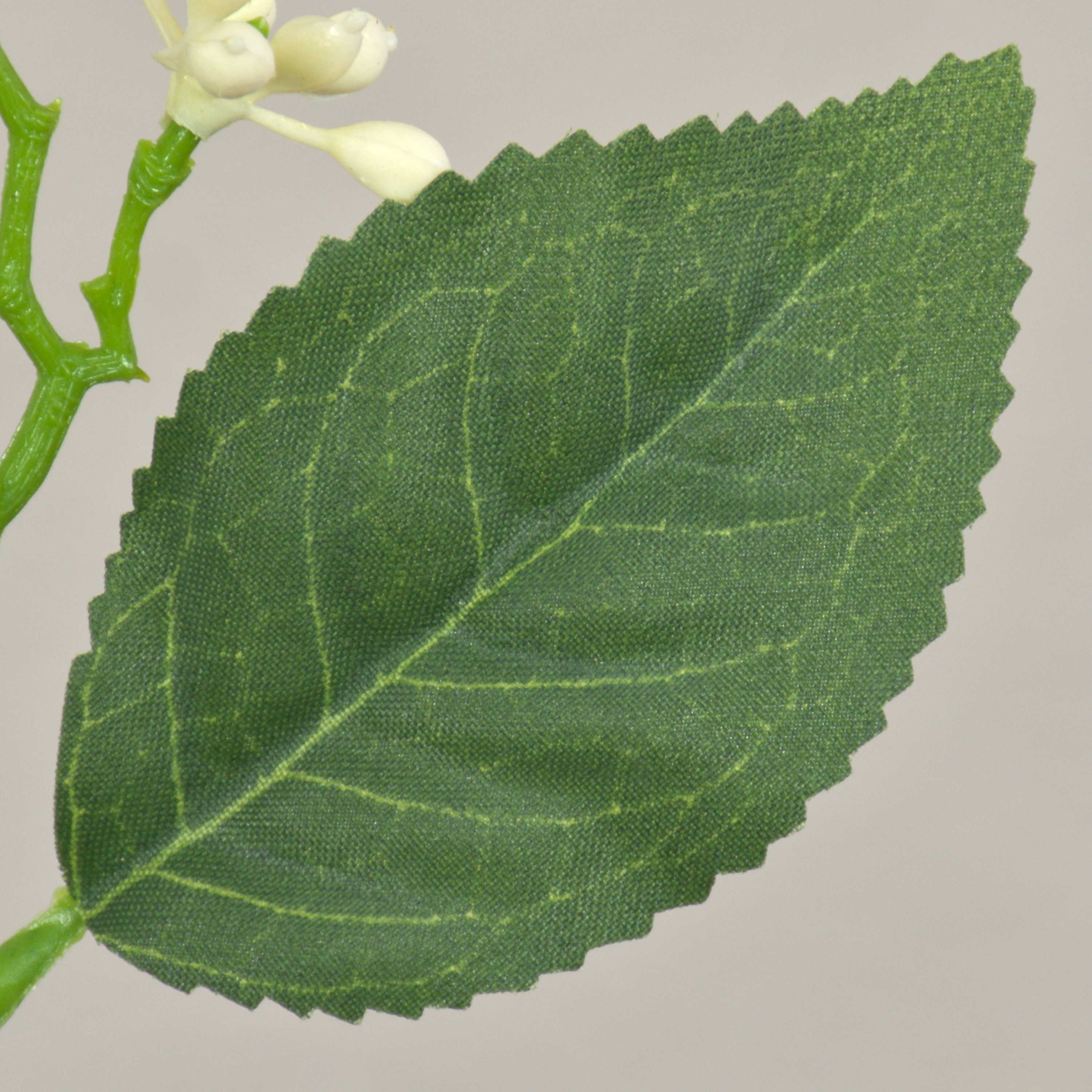 - Der Kunststoff Stiel verzweigt sich nach oben hin, die Kunststoff Knospen sind in Form einer Dolde angeordnet, die grünen Textilblätter haben eine deutliche Aderung