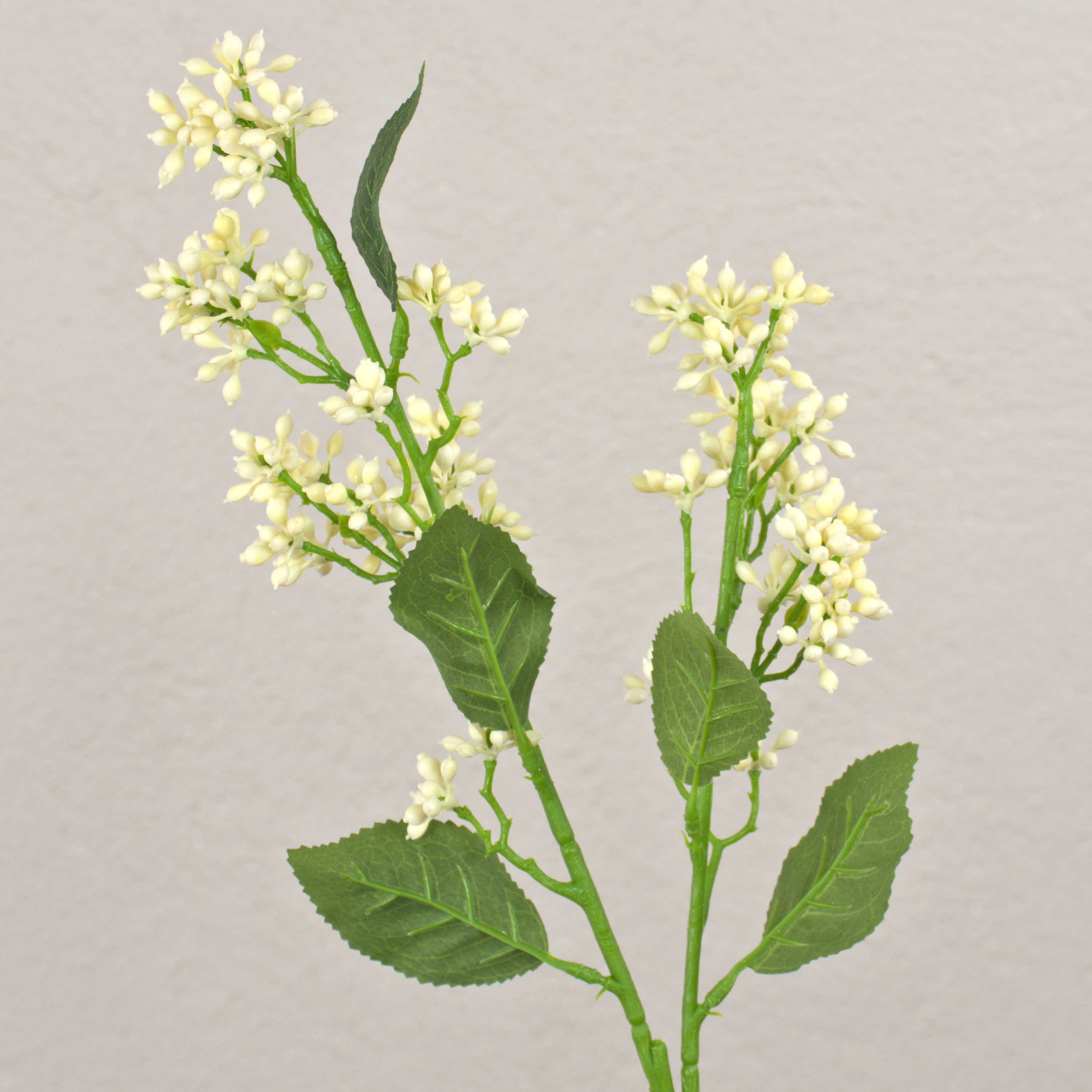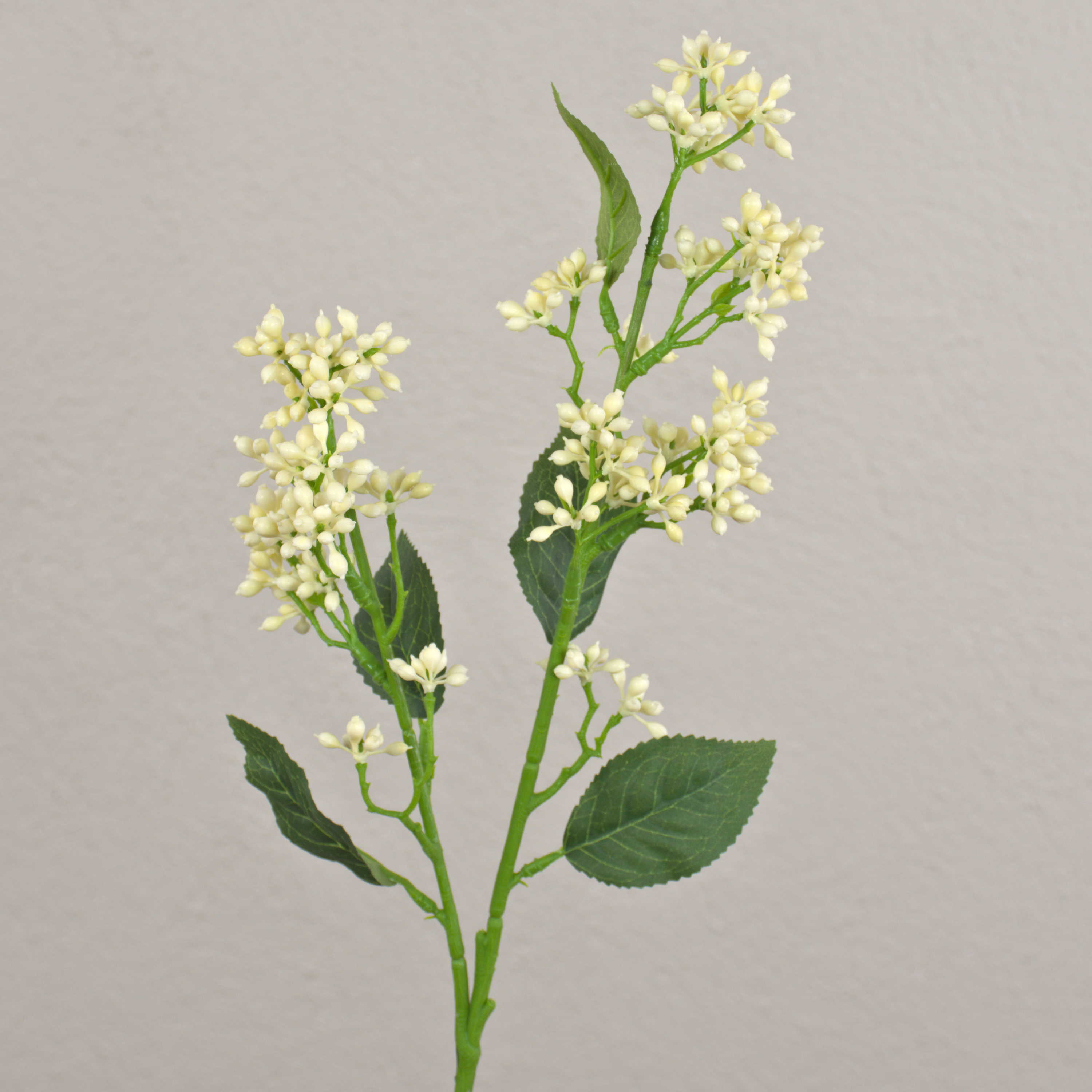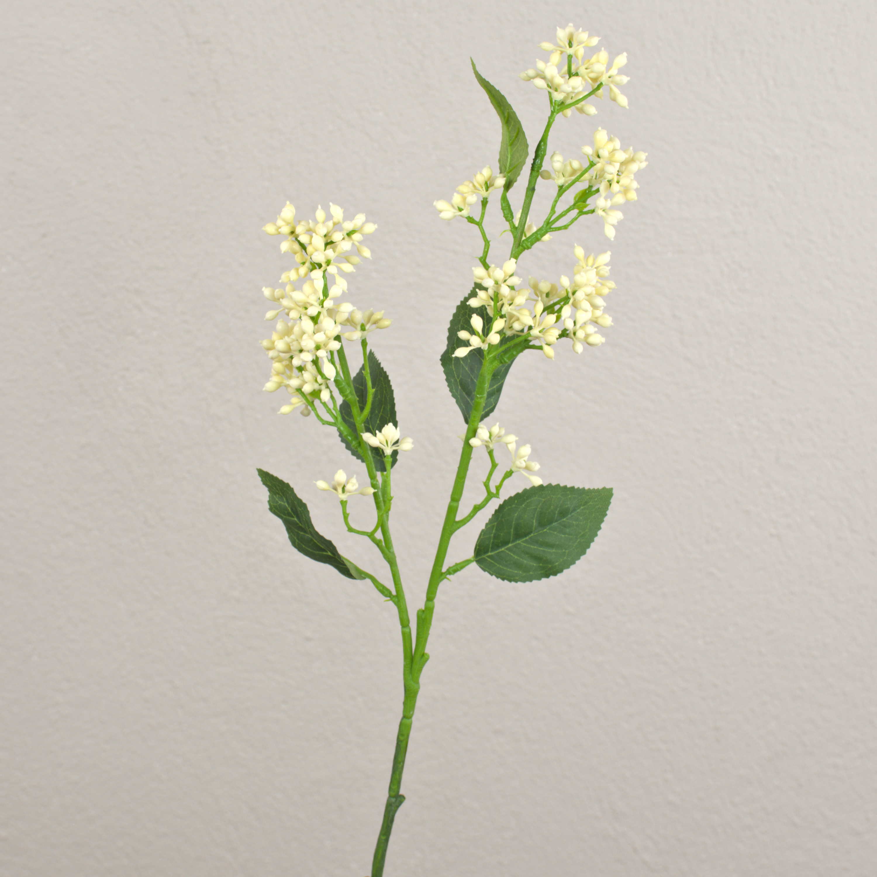 - Der Kunststoff Stiel verzweigt sich nach oben hin, die Kunststoff Knospen sind in Form einer Dolde angeordnet, die grünen Textilblätter haben eine deutliche Aderung