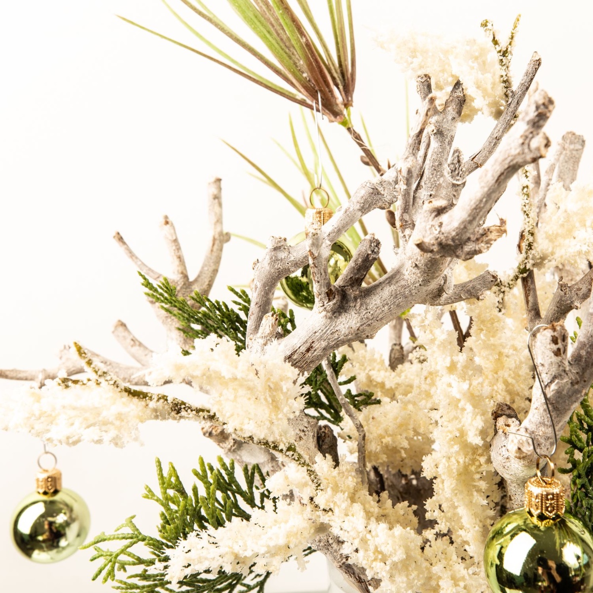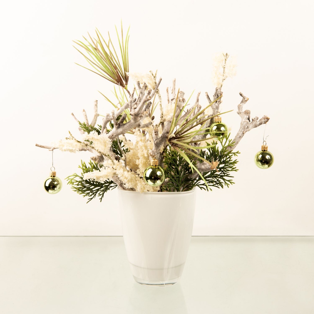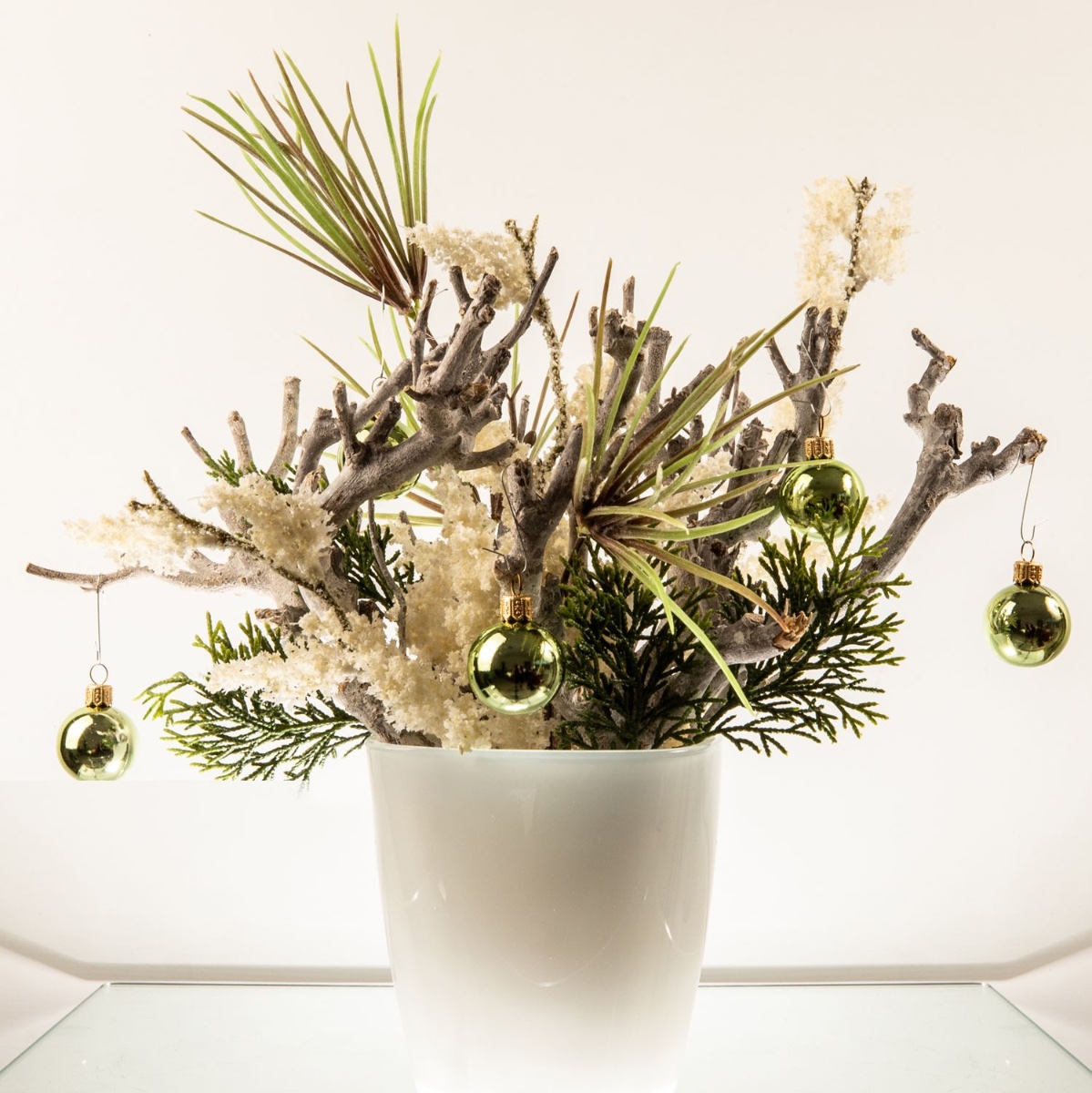 Weiß und Grün! Als Basis wurden weiß-gekalkte Zweige verwendetet, die mit einem Pinienzweig und einem Zedernzweig zu einem schönen Arrangement gestaltet wurden. Ein weißer Orchideentopf eignet sich perfekt für die kurzen Holzzweige. Ein besonderer Eyecatcher ist der weiße Besenheide Zweig, der wirkt, als wäre gerade der erste Schnee gefallen. Die grünen Kugeln erzeugen die weihnachtliche Stimmung. Shop the Look!