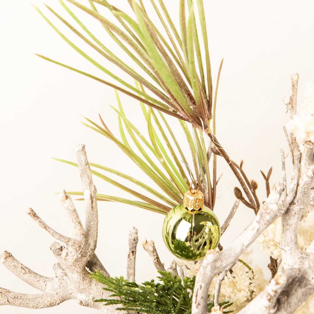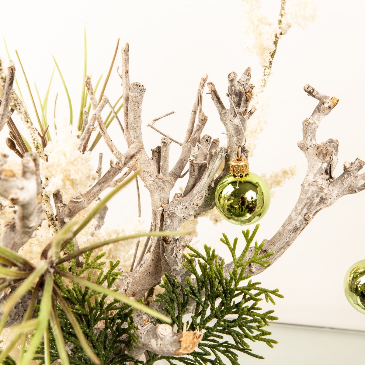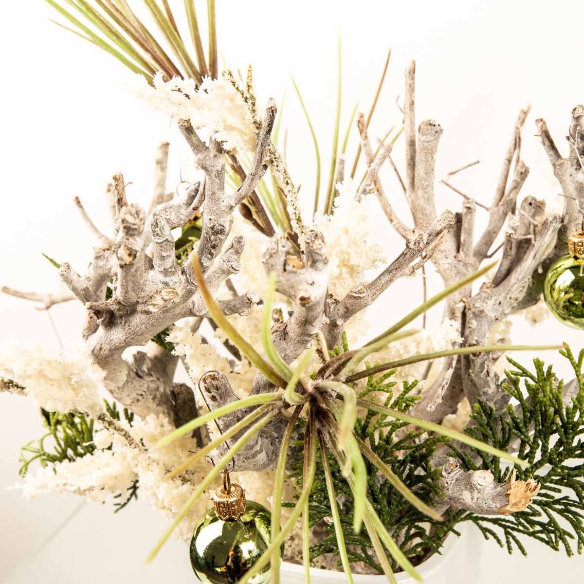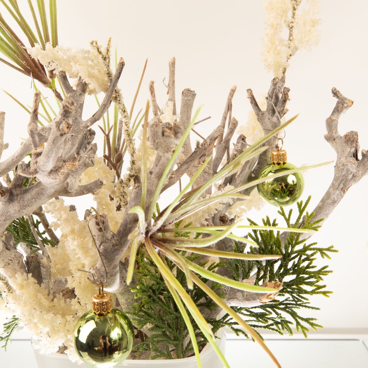 Weiß und Grün! Als Basis wurden weiß-gekalkte Zweige verwendetet, die mit einem Pinienzweig und einem Zedernzweig zu einem schönen Arrangement gestaltet wurden. Ein weißer Orchideentopf eignet sich perfekt für die kurzen Holzzweige. Ein besonderer Eyecatcher ist der weiße Besenheide Zweig, der wirkt, als wäre gerade der erste Schnee gefallen. Die grünen Kugeln erzeugen die weihnachtliche Stimmung. Shop the Look!