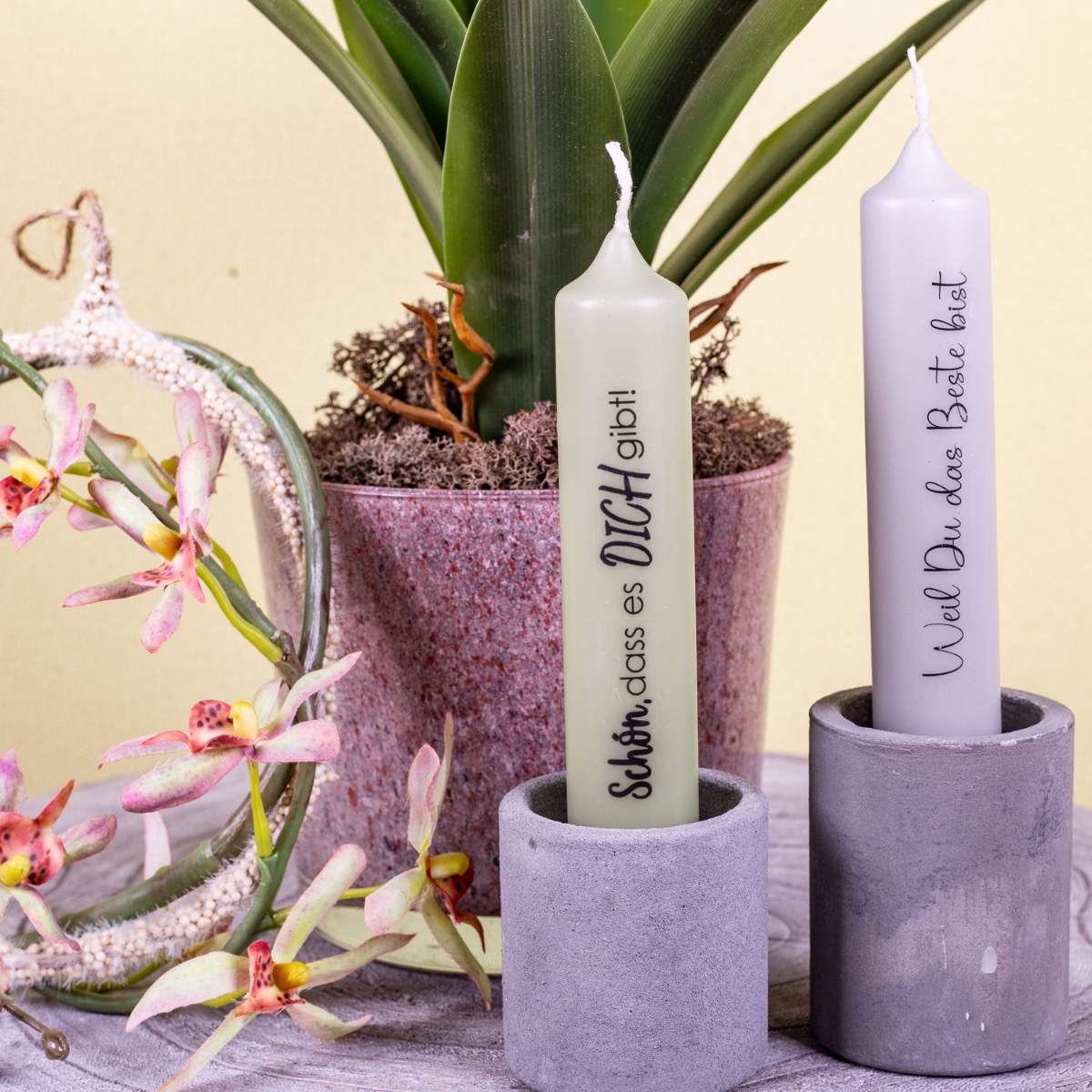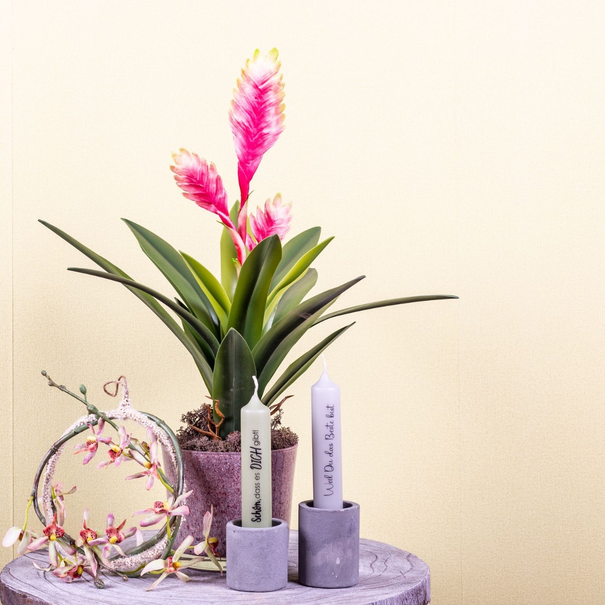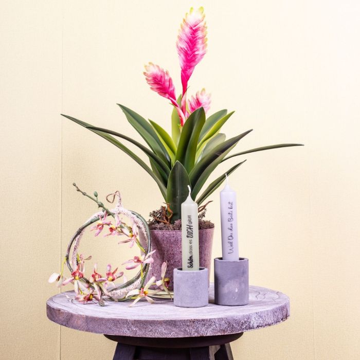 Zarte Farben und ein leuchtendes Pink! Die Bromelie mit ihrem fast neonfarbigen Pink bringt ein Leuchten in den Raum. In Südamerika ist diese Blüte das Symbol für „ein Geschenk der Götter“, als Zimmerpflanze soll sie vor Unheil schützen. Ein weiteres Leuchten bringen die zwei Kerzen, die eine liebevolle Botschaft überbringen. Unser vielseitig einsetzbarer Dekoring wurde hier mit einem zarten Orchideenzweig umwickelt und kann als Wanddeko verwendet werden. Ein schönes Geschenk für eine geliebte Person! Shop the Look!