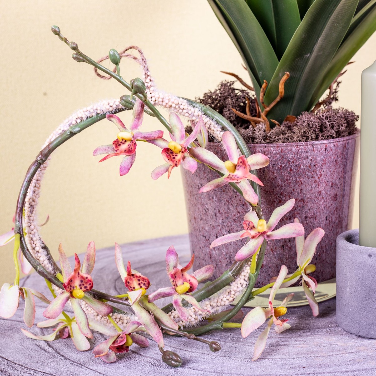 Gestaltungstipp: Die Bromelie zurechtbiegen und in den Topf stellen. Etwas Naturmoos darüber. Der zarte Orchideenzweig wird um den beflockten Ring gewickelt. Als Pflanzenanhänger oder Wanddeko geeignet.