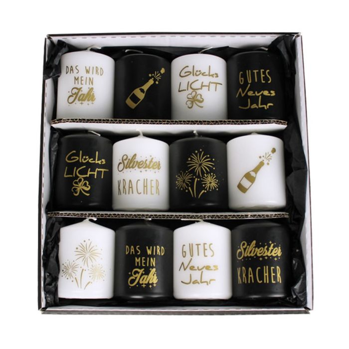Silvester Flachkopfkerzen OVILA, 12 Stück, schwarz-weiß-gold, 8cm, Ø6cm - Made in Germany
