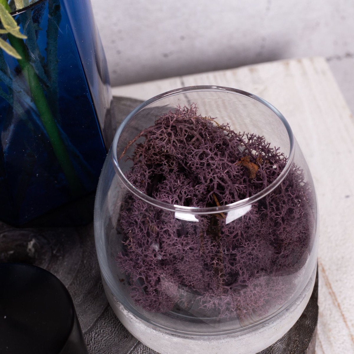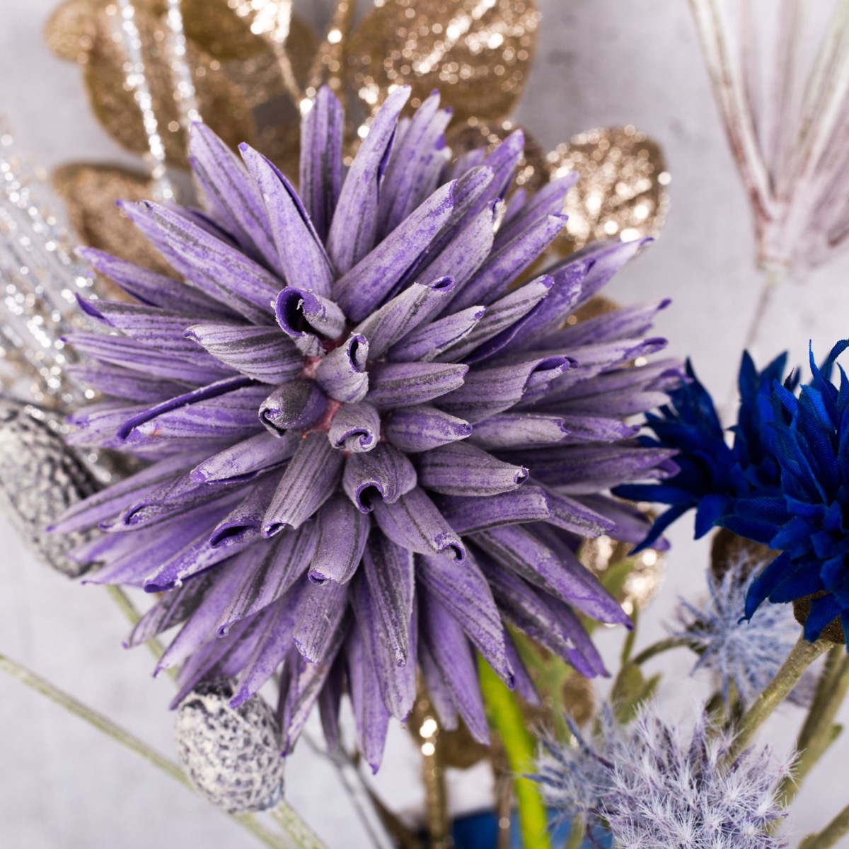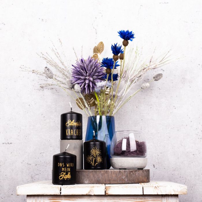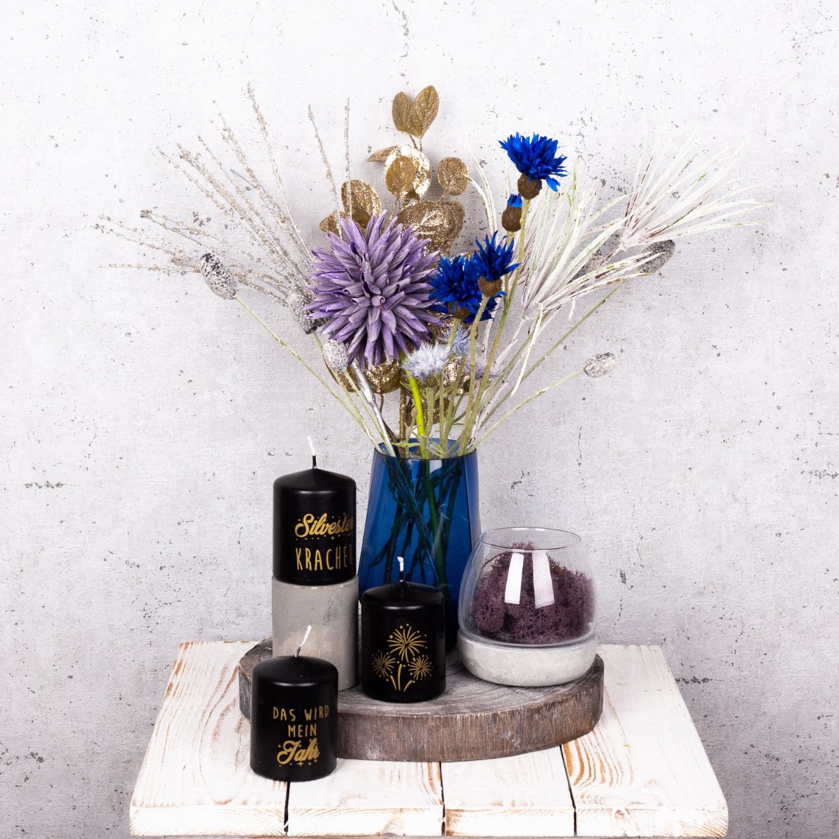 Lila und Blau! Eine untypische Farbkombination, die hier eine frische und farbenfrohe Winterstimmung erzeugt. Mit den Silvesterkerzen eignet sich dieser Look sehr gut für eine Silvester Party, um gemeinsam das Jahr zu beenden. Der kleine Strauß aus blauen Kornblumen und einem fliederfarbenen Zierlauch wirkt schon wie ein kleines Feuerwerk, das von gefrorenen Pinienzweigen und dem glitzernden Kiefernzweig unterstrichen wird. Das Kerzenglas mit Betonfuß wurde von uns mit farblich passendem Naturmoos gefüllt. Dann kann die Party ja losgehen. Shop the Look!