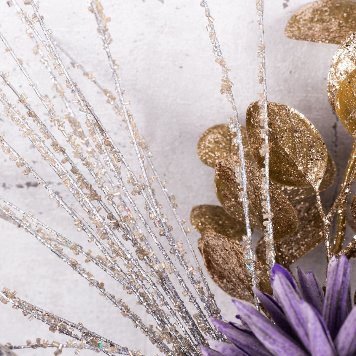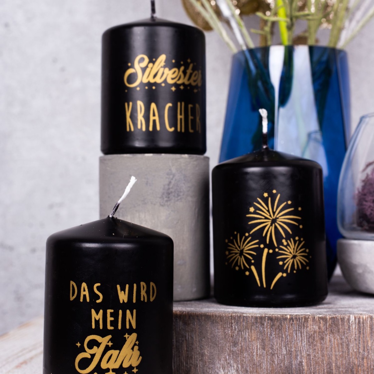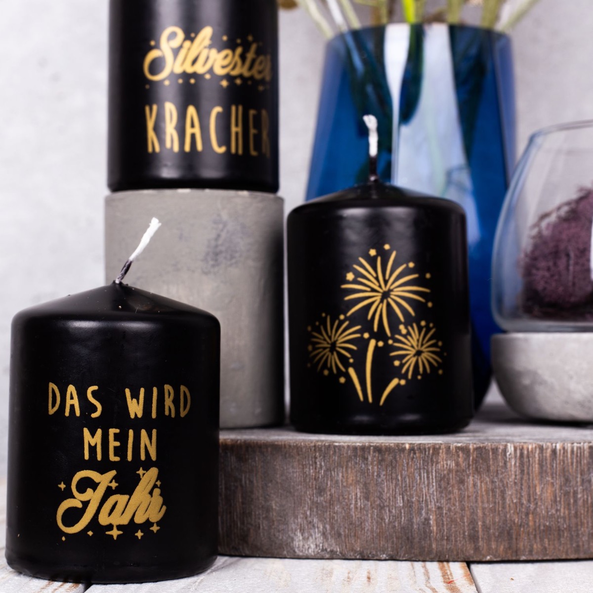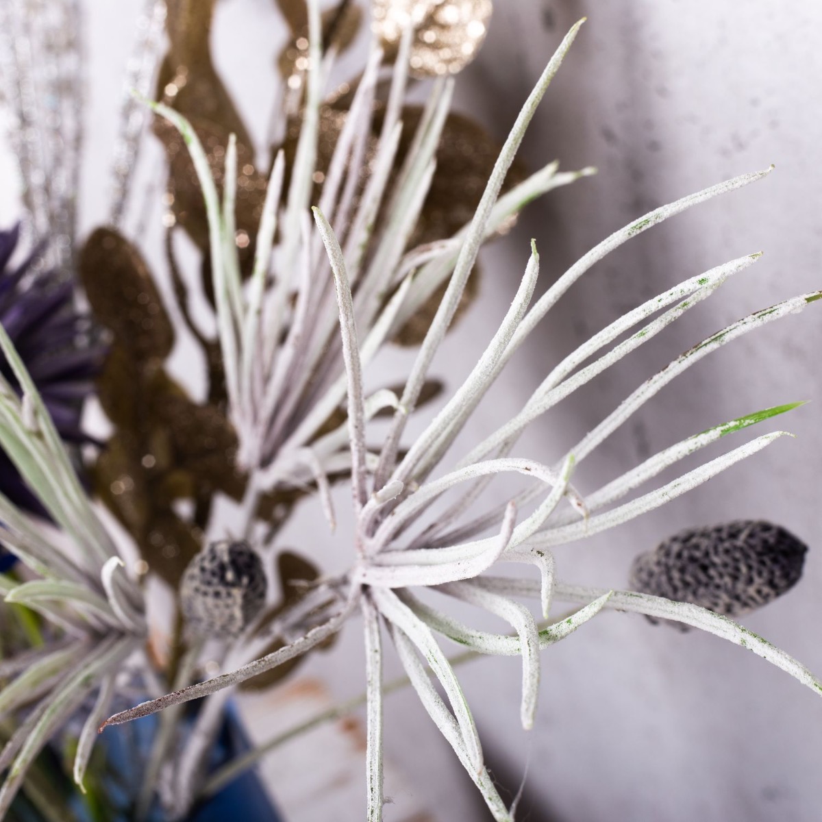 Lila und Blau! Eine untypische Farbkombination, die hier eine frische und farbenfrohe Winterstimmung erzeugt. Mit den Silvesterkerzen eignet sich dieser Look sehr gut für eine Silvester Party, um gemeinsam das Jahr zu beenden. Der kleine Strauß aus blauen Kornblumen und einem fliederfarbenen Zierlauch wirkt schon wie ein kleines Feuerwerk, das von gefrorenen Pinienzweigen und dem glitzernden Kiefernzweig unterstrichen wird. Das Kerzenglas mit Betonfuß wurde von uns mit farblich passendem Naturmoos gefüllt. Dann kann die Party ja losgehen. Shop the Look!