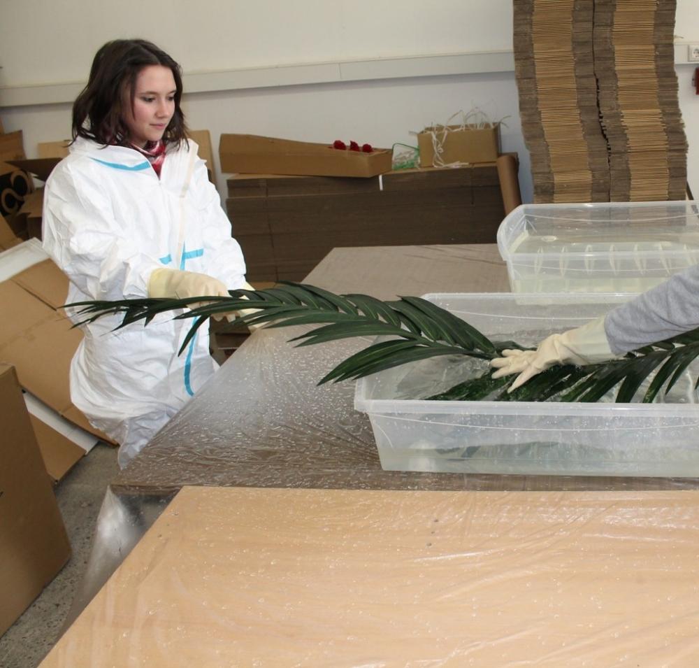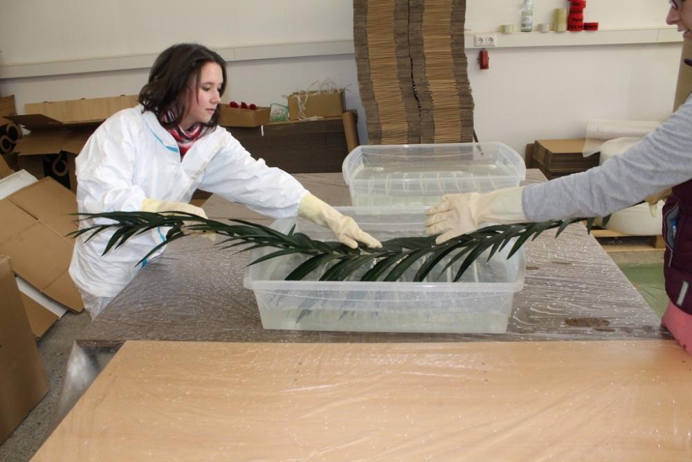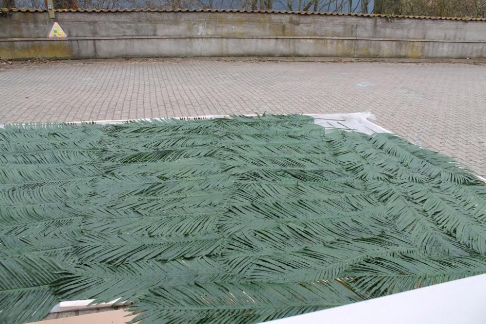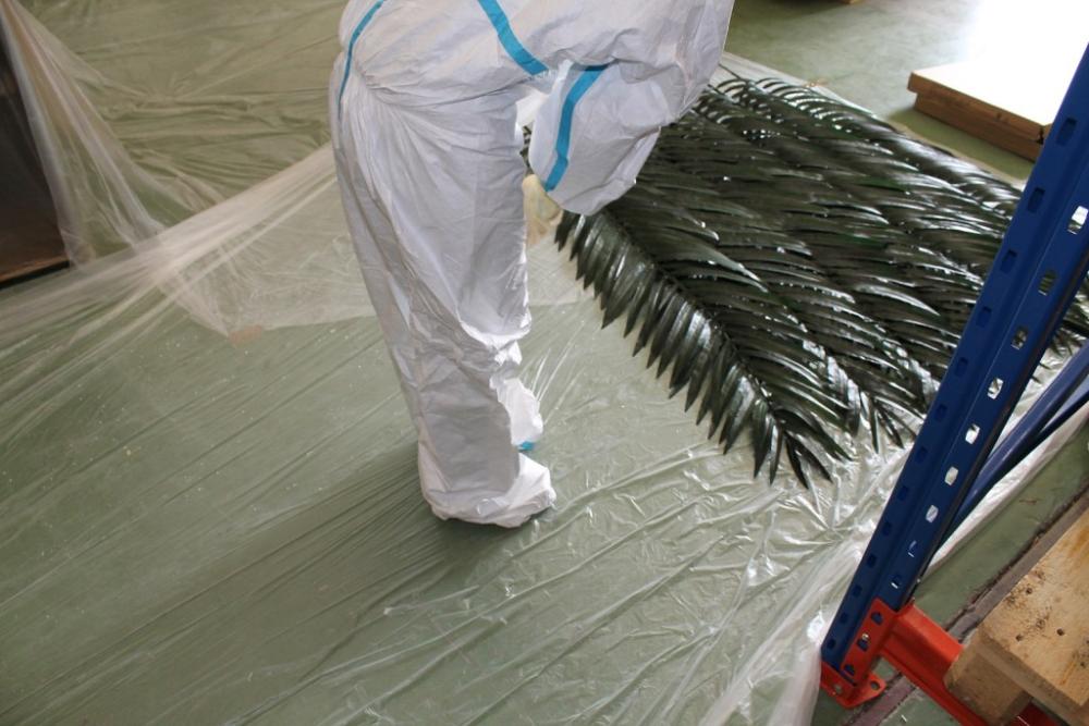 Wie bereits oben beschrieben handelt es sich beim Einsatz der Palmwedel um Einkaufsfilialen, also um öffentlich zugängliche Plätze. Dort herrschen, wie ihr vielleicht wisst, besondere Vorsichts- und Schutzmaßnahmen, vor Allem was Brandschutz angeht. Deshalb war es natürlich höchste Priorität die künstlichen Palmenwedel nach den gängigen Brandschutzbestimmungen für öffentliche Gebäude (B1) zu behandeln. Da es sich um einen großen Auftrag handelte und wir zur damaligen Zeit noch an unserem alten Standort befanden, der nicht gerade groß war, war dies schon eine Mammutaufgabe für uns. Wir stellen uns aber natürlich gerne jeder Herausforderung und so haben wir uns auch diesmal mit Eifer ans Werk gemacht. Normalerweise werden Kunstpflanzen mit einem Brandschutz-Spray eingesprüht, um sie so brandsicher zu machen. Bei so großen Artikeln wie den Palmenwedeln und der großen Menge, die der Kunde bestellt hatte, haben wir uns jedoch dazu entschieden, die Wedel in B1-Schutzlack zu tauchen. Das geht nicht nur schneller, sondern das Brandschutzmittel zieht auch tiefer und besser in die Textilfasern der Kunstpflanzen ein.