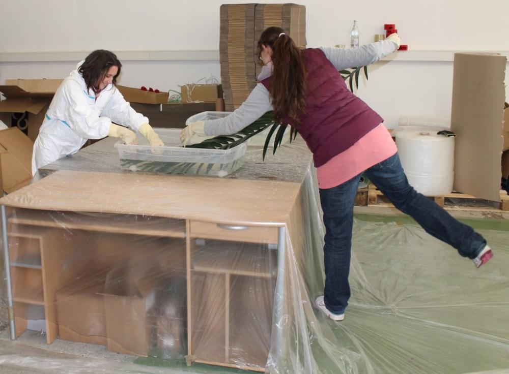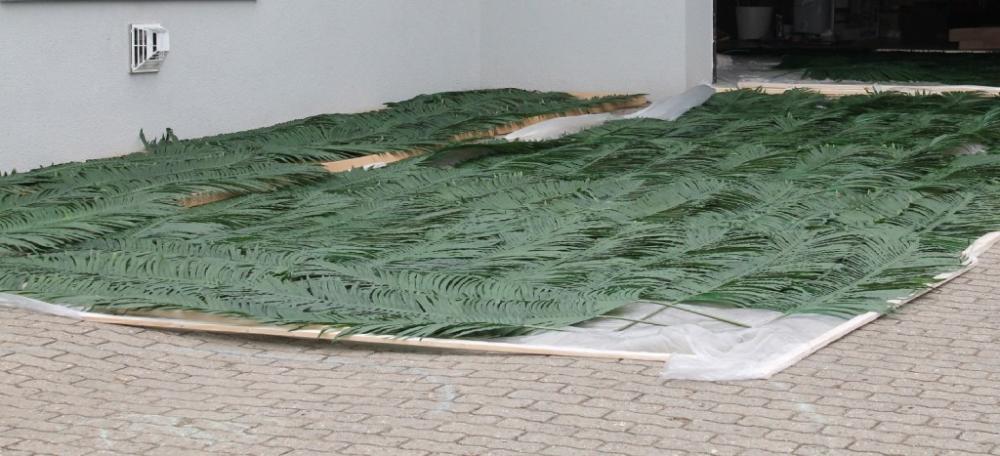Nun fragt ihr euch vielleicht, warum wir uns in solch super schicke Ganzkörperanzüge geworfen haben. Nein, es liegt nicht daran, dass das Brandschutzmittel giftig oder gefährlich wäre, sondern weil das ganze Eintauchen eine sehr klebrige Geschichte ist. Erst wenn der Schutzlack eingezogen ist, verliert das Ganze seinen klebrigen Charakter. Um die vielen Palmenwedel trocknen zu können, haben wir unsere Halle in ein Paradies aus Kartonagen und Abdeckfolie verwandelt. Da die Halle, wie bereits gesagt, nicht besonders groß war, haben wir die Brandschutzbehandlung in mehreren Etappen durchgeführt und nach und nach hatten wir ein richtiges Meer aus Palmenwedeln in und vor der Halle.
