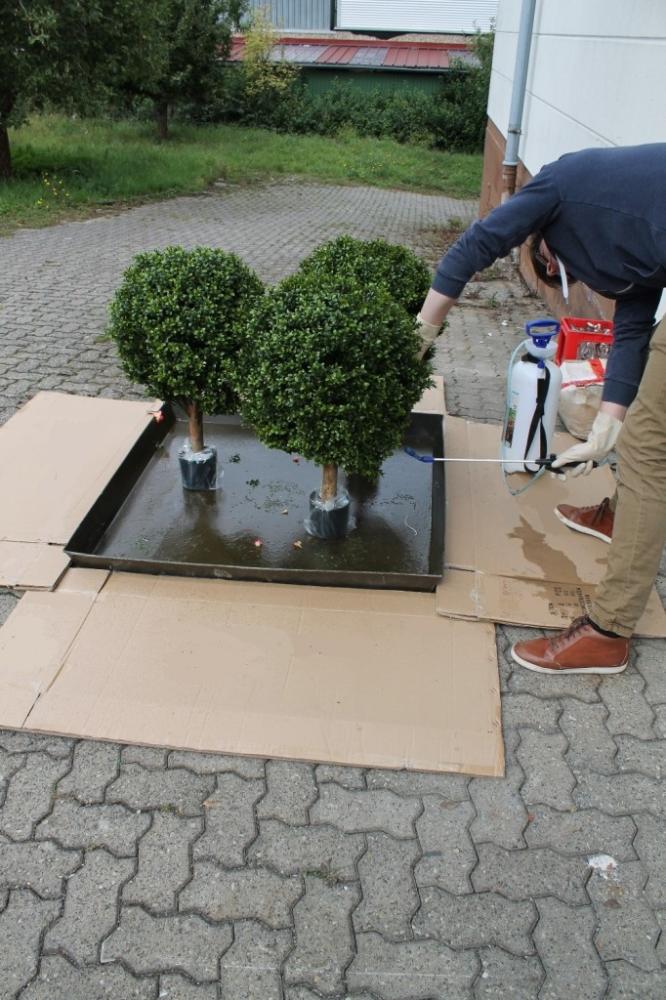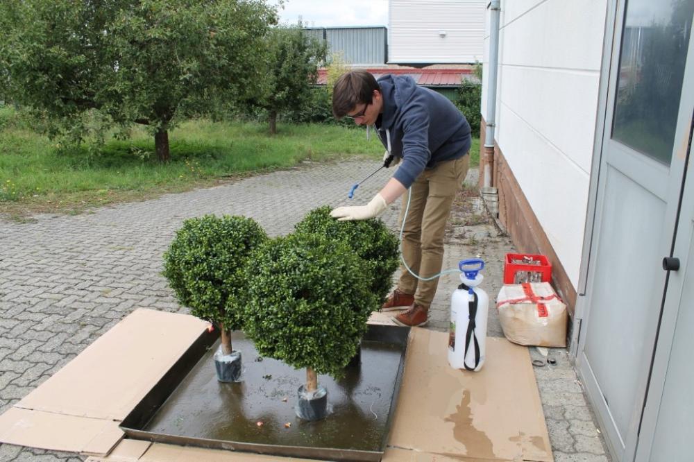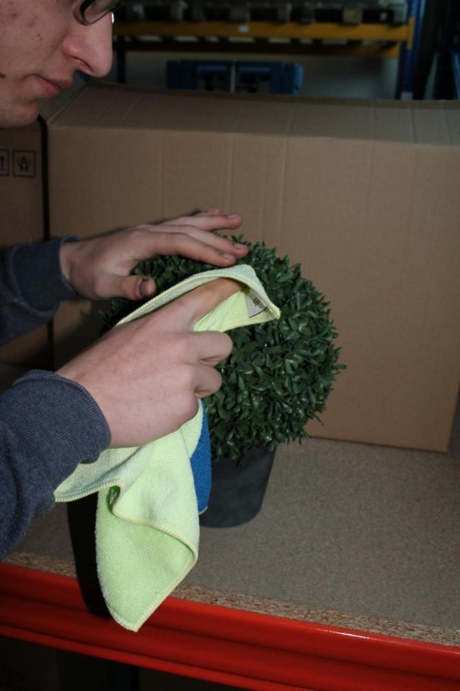 Reinigung einer eingetopften künstlichen Buchskugel vor ihrer UV-Schutz-Behandlung