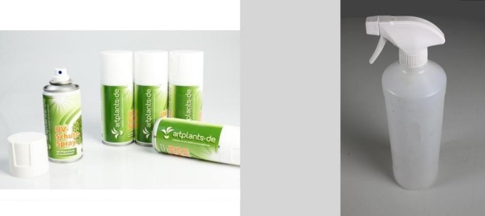 links: UV-Schutz-Spray mit Pflegewirkung für Kunstpflanzen in Druckflasche; Rechts: UV-Schutzmittel in Pumpflasche