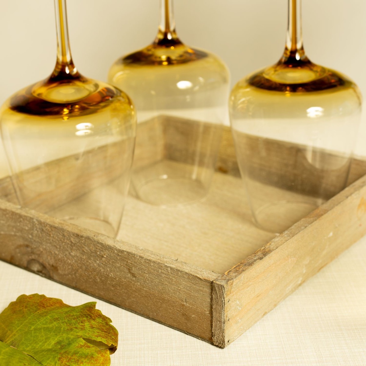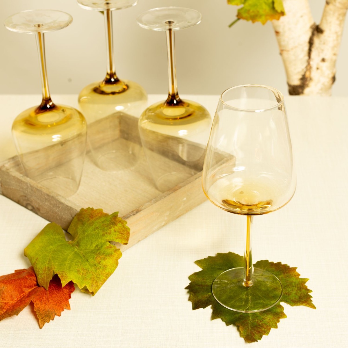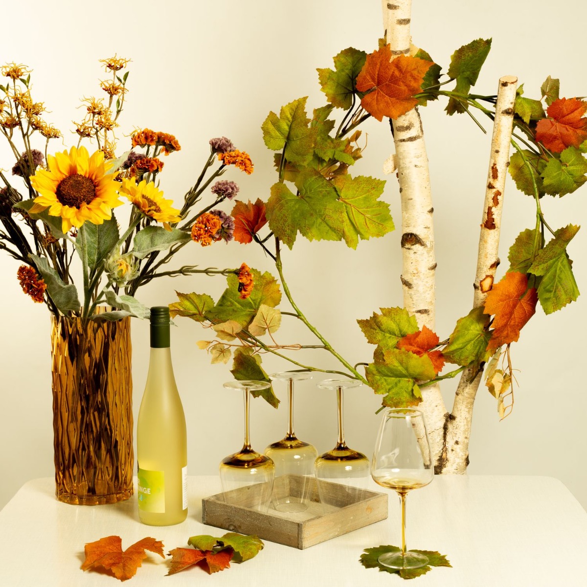 Gestaltungstipp: Die Blumen zu einem Strauß binden und in die Vase stellen. Eventuell kürzen. Die Weinblätter an einer passenden Stelle als ring oder gerade hängen. Die Gläser auf dem Tablett anrichten. Wir haben ein paar Weinblätter als Untersetzer umfunktioniert. Dafür sollte man aber das grüne Plastik von der Rückseite entferne. Es kann einfach abgezogen werden.
