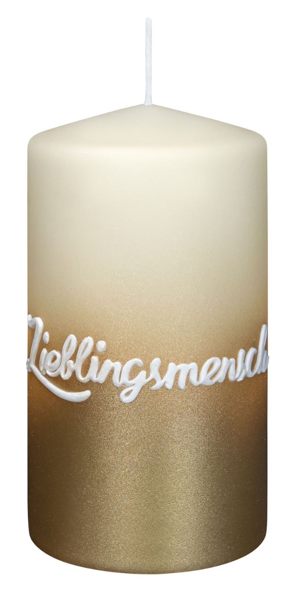 Stumpenkerze JARDENA mit Schrift, Lieblingsmensch, bisquit-gold, 13cm, Ø7cm, 52h