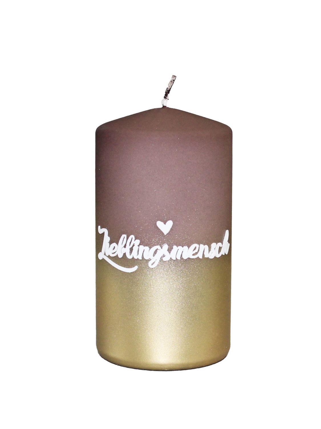 Stumpenkerze JARDENA mit Schrift, Lieblingsmensch, braun-gold, 13cm, Ø7cm, 52h