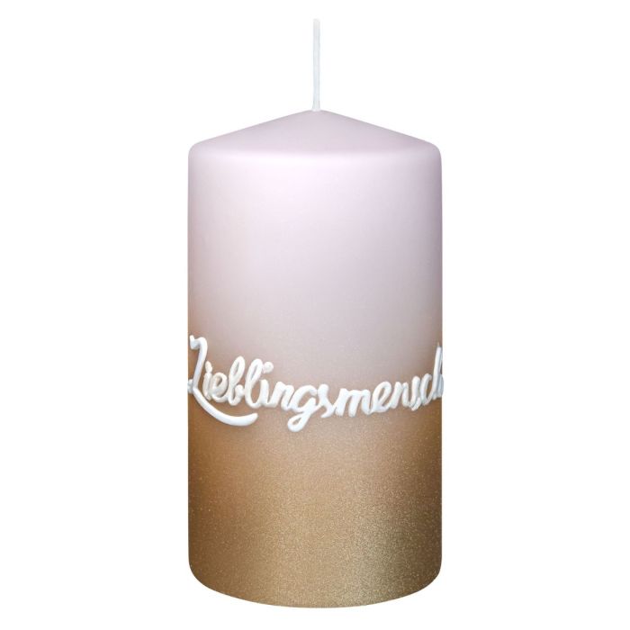 Stumpenkerze JARDENA mit Schrift, Lieblingsmensch, zartrosa-gold, 13cm, Ø7cm, 52h