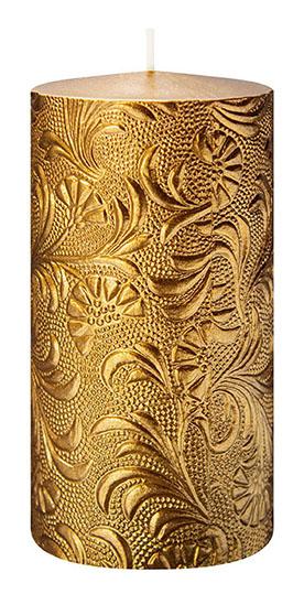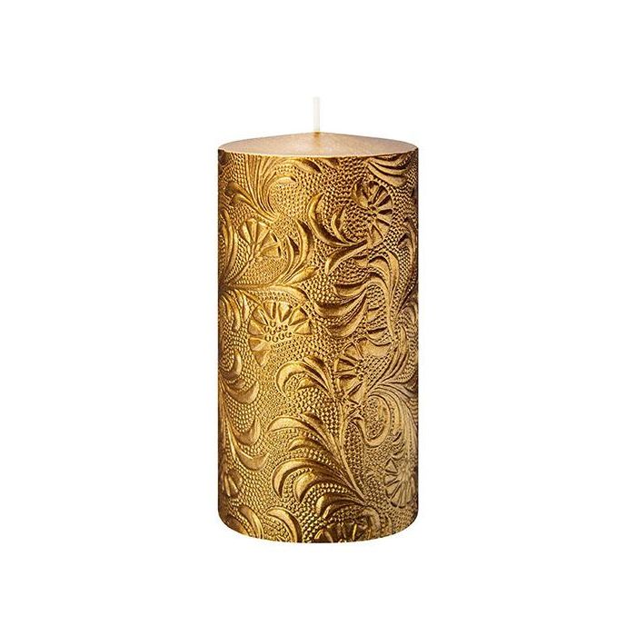 Stumpenkerze VALENTIANO, Florales Muster, gelbgold, 13cm, Ø6,8cm, 52h - Made in Germany