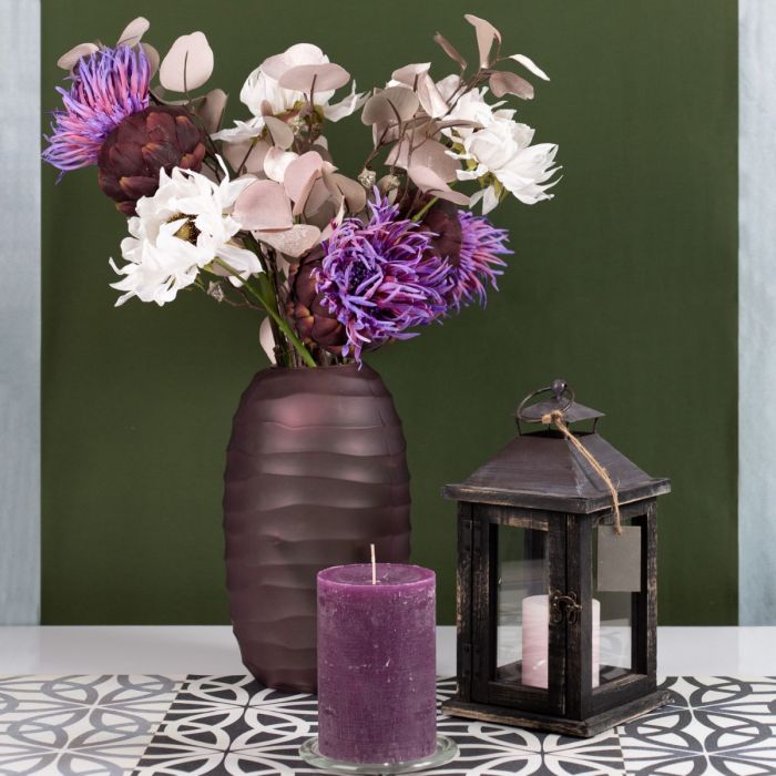 Eleganter Sommerabend! Die Glas Vase im matten Wellendesign ist bestückt mit einer extravaganten Kombination aus Kunstblumen. Ausgefallene weiße Sonnenblume, imposante violette Artischocke und samtige rosa farbige Eukalyptuszweige machen das Ensemble vollständig. Zwei Stumpenkerzen in passender Farbe mit rustikaler Laterne und Kerzenteller runden den Look stilvoll ab. Wollen auch Sie Ihrem Wohnraum neuen Glanz verleihen? Shop the Look!