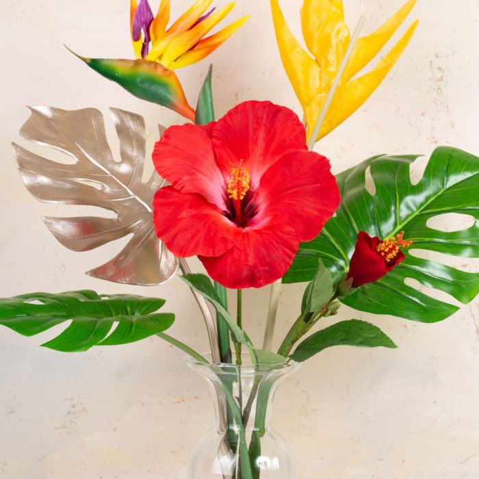 Exotische Zweige! Sie wollen den Sommer zu sich nach Hause holen? Dann ist diese Kombination aus exotischen Blumen, geschlitzten Monstera Blättern und eleganter schmaler Vase genau das richtige für Sie. Die Rote Hibiskus Blüte im Mittelpunkt des Geschehens wird umrahmt von Monstera Blättern in champagner und grün. Eine bunte Strelitzien Blüte sowie orangefarbige Helikonien Blüte ragen keck aus dem Strauß im Hintergrund hervor. Ein Blumenensemble, dass Lust auf Sonne, Strand und Meer mit einem leckeren Eis in der Hand macht. Wollen auch Sie Ihrem Wohnraum neuen Glanz verleihen? Shop the Look!