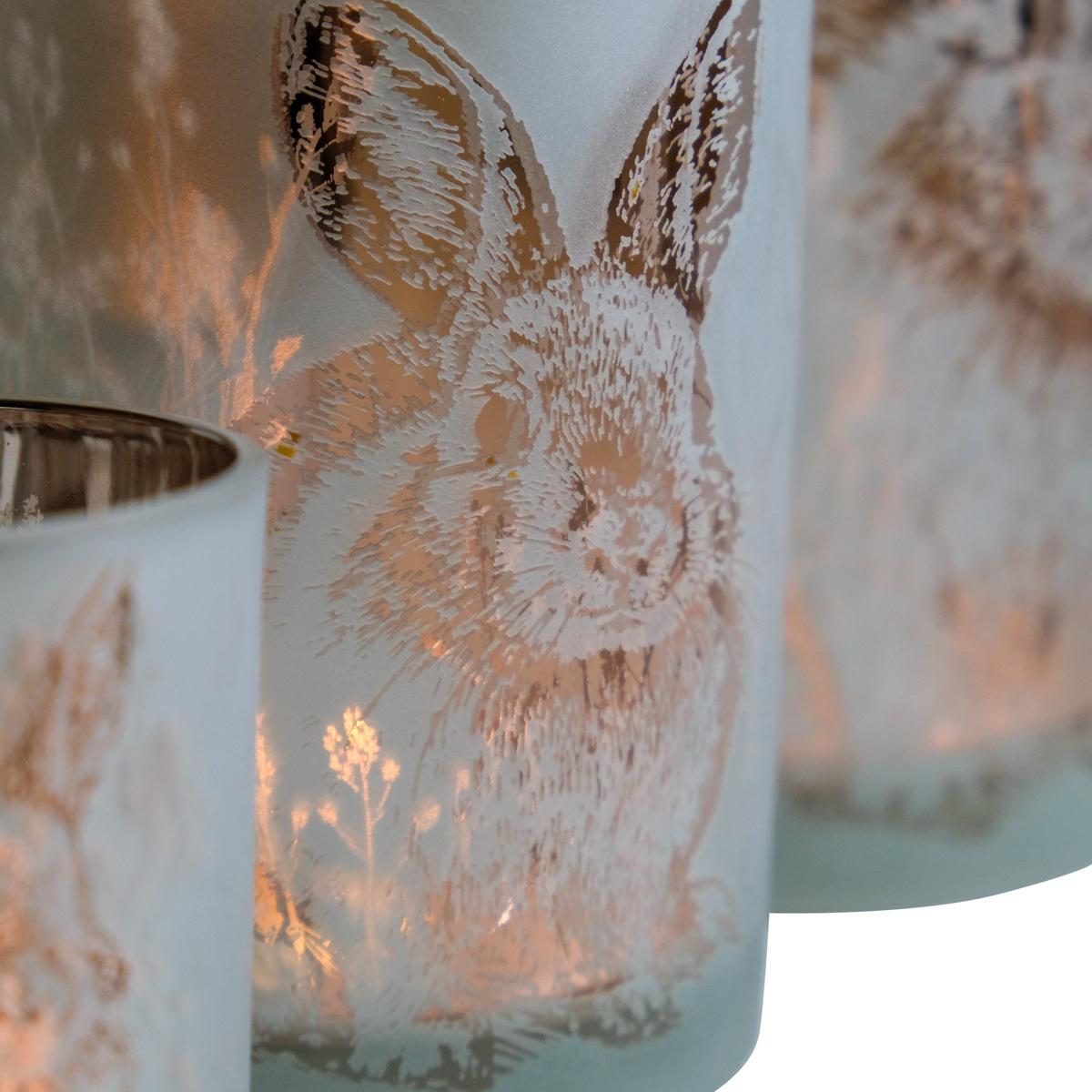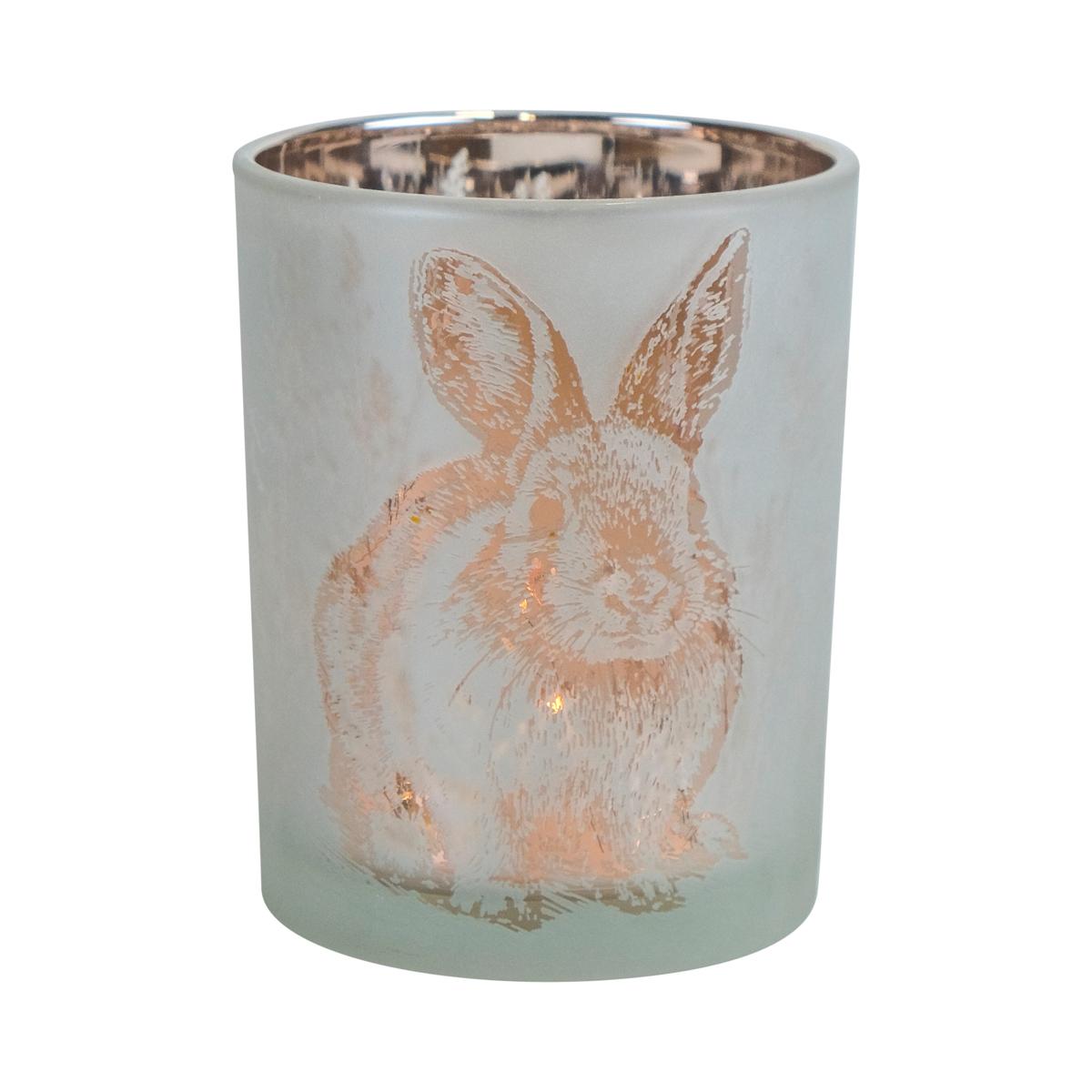 Teelicht Glas Kerzenhalter FRANCISKA mit Hasen Motiv, weiß-matt-bronze-glänzend, 12,5cm, Ø10cm