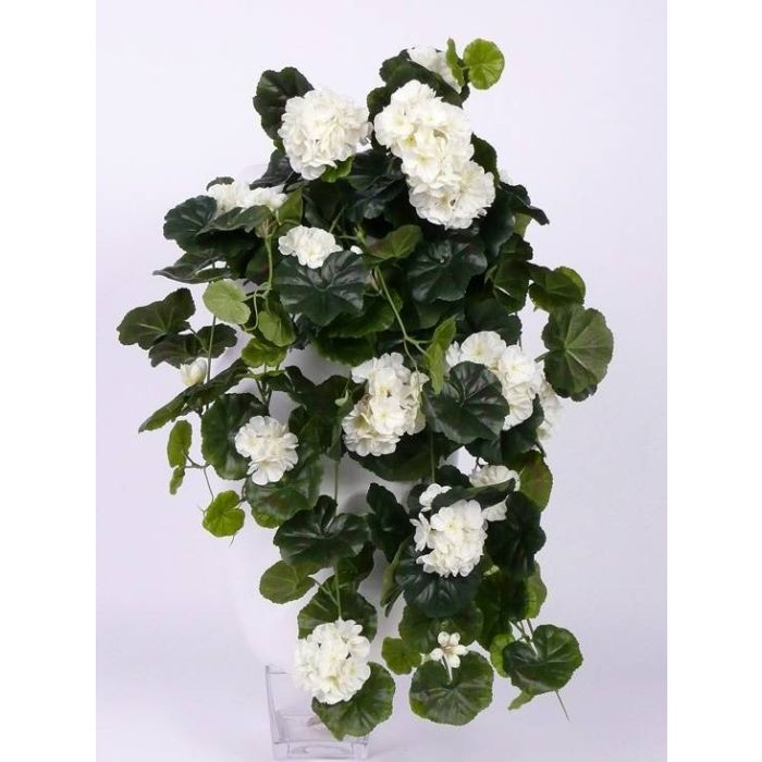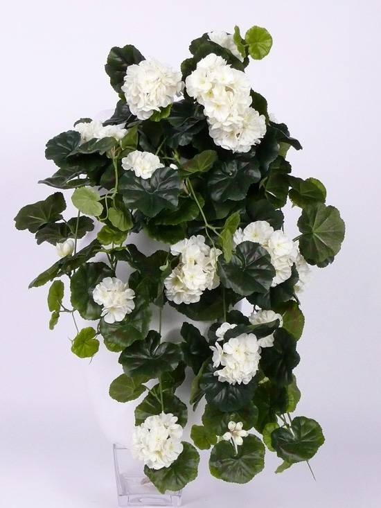 Großer Kunst Geranien Hänger ANTON mit ca. 10 weissen Blüten Dolden und ca. 130 dunkelgrünen Blättern. Inklusive Steckstab ist der künstliche Hänger ca. 65 cm lang und hat einen Durchmesser von ca. 35 cm.