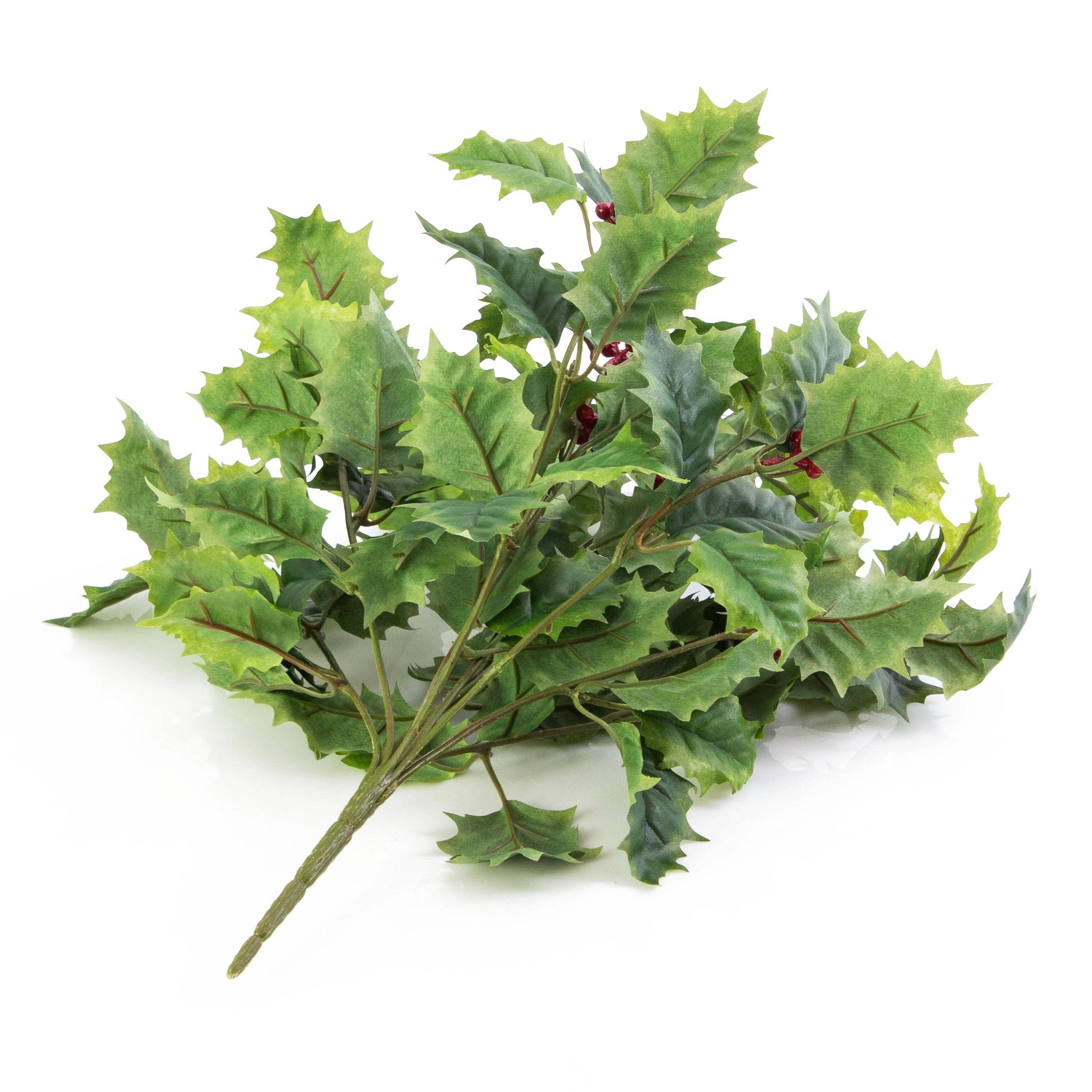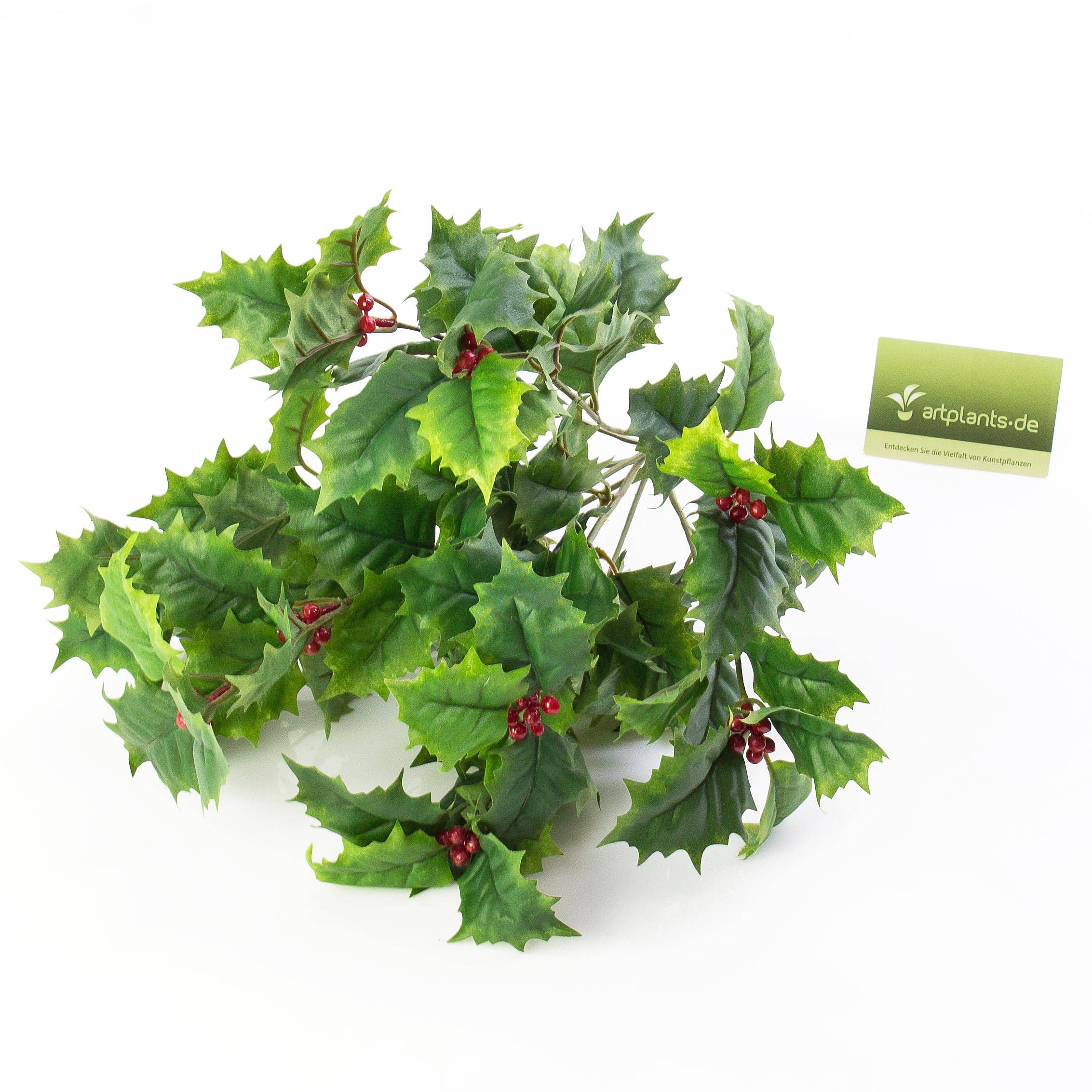 Kunst Ilex Zweig mit 90 grün gezackten Blättern verteilt auf 9 Zweige. Der ca. 45 cm hohe Zweig hat viele rote Beeren und eignet sich besonders gut für die herbstliche und winterliche Dekoration Zuhause.
